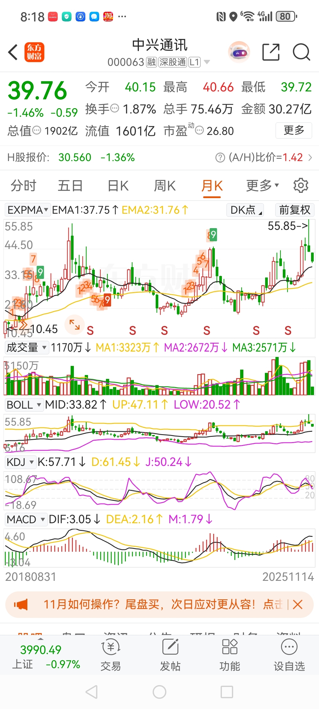 进场时机很重要。对于升幅翻倍的机构外资和散户都欢喜的股票尤其要当心。下图是中兴通讯的月线图,你认为现在买是好时机吗?