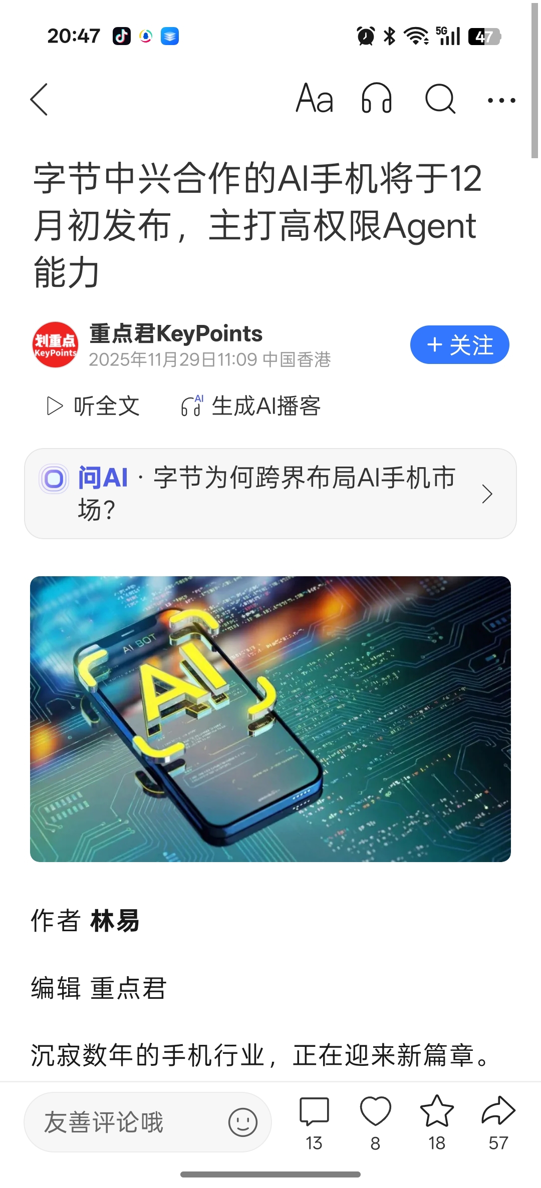 中兴通讯和字节跳动携手推出AR手机12月初即将上市
