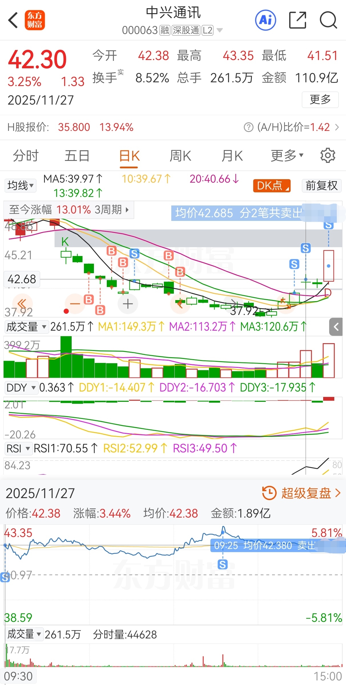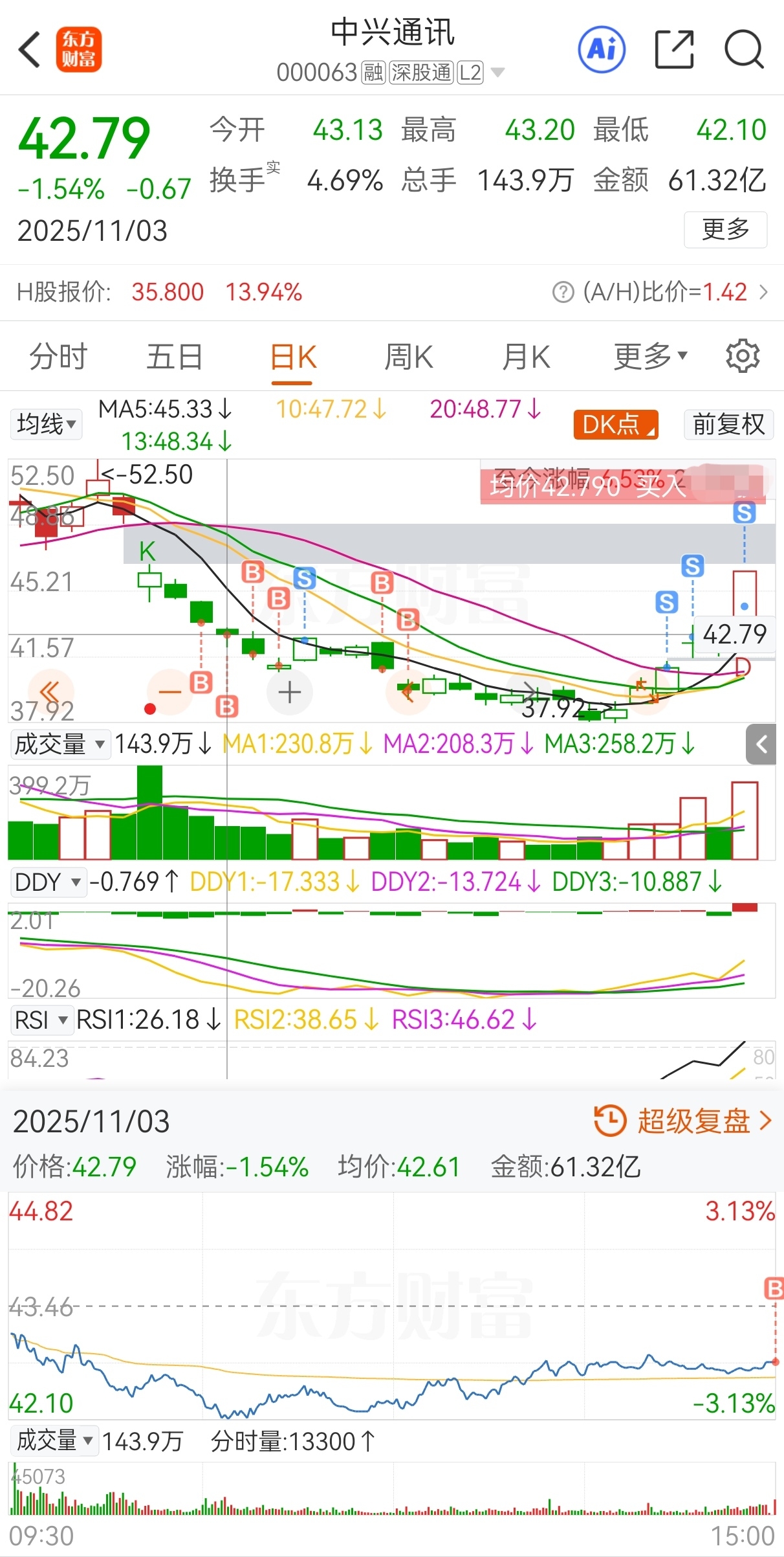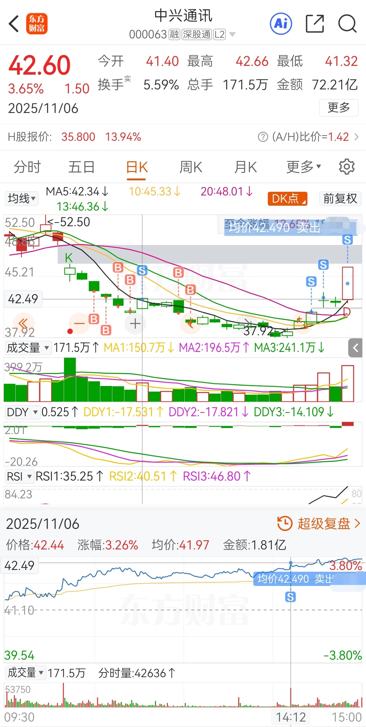 $中兴通讯(SZ000063)$ 原计划今买明卖,实际43.46买,42.79加仓,41.73再加仓,41.1继续加仓,42.49减仓,40.9又加仓,39.73还加仓,40.99再减仓,42.38继续减仓,42.99又减仓,43.99还减仓,44.49卖,实盘短线套利中兴通讯,成功收米走人!