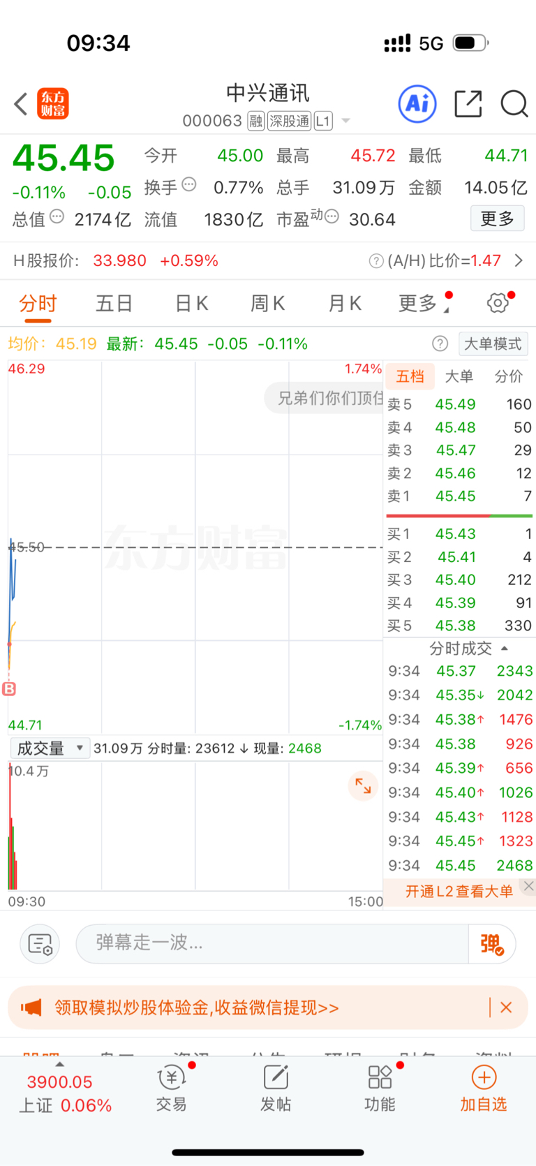 45.12水下低吸介入$中兴通讯(SZ000063)$ #强势机会# #实盘记录# #投资干货# #股市怎么看#