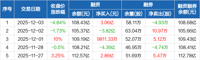 中兴通讯融资融券信息显示,2025年12月3日融资净买入3.06亿元;融资余额108.43亿元,较前一日增加2.91%。