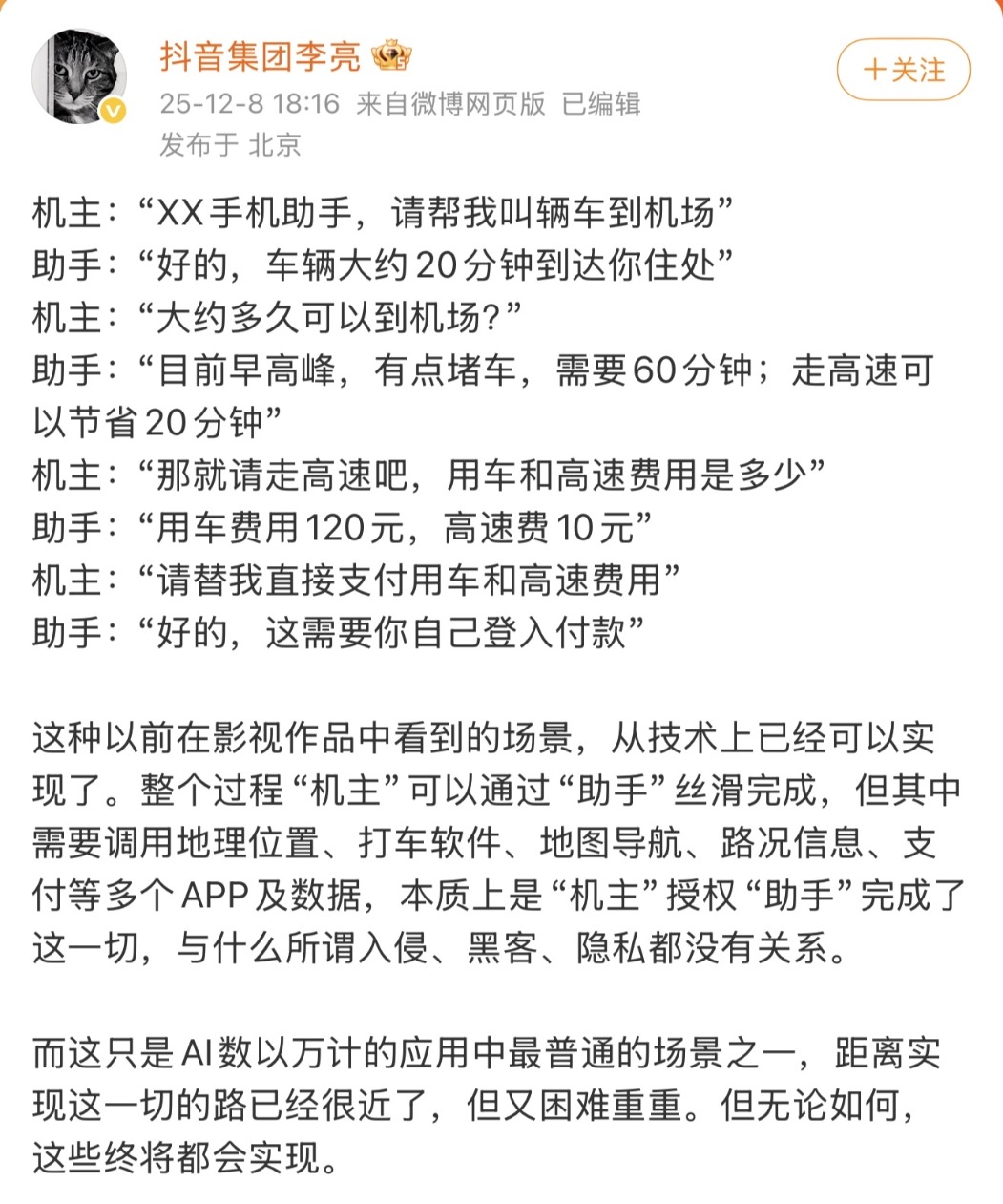 上证报中国证券网讯(记者罗茂林)12月9日,抖音副总裁李亮发微博谈及豆包与中兴合作推出的AI手机助手。李亮认为,AI带来的变革是真实存在的,用户需求也是真实存在的,豆包和中兴的探索是一个开始。此前一天,李亮以打车场景举例,介绍了当前手机在实现复杂需求时的自动化操作。他认为,该功能的本质是机主授权助手完成操作,属于合法合规的数据使用范畴。