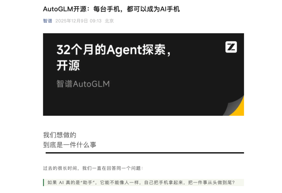 12月9日,智谱华章宣布开源AutoGLM,这被行业定义为“全球首个具备Phone Use能力的AI Agent”。