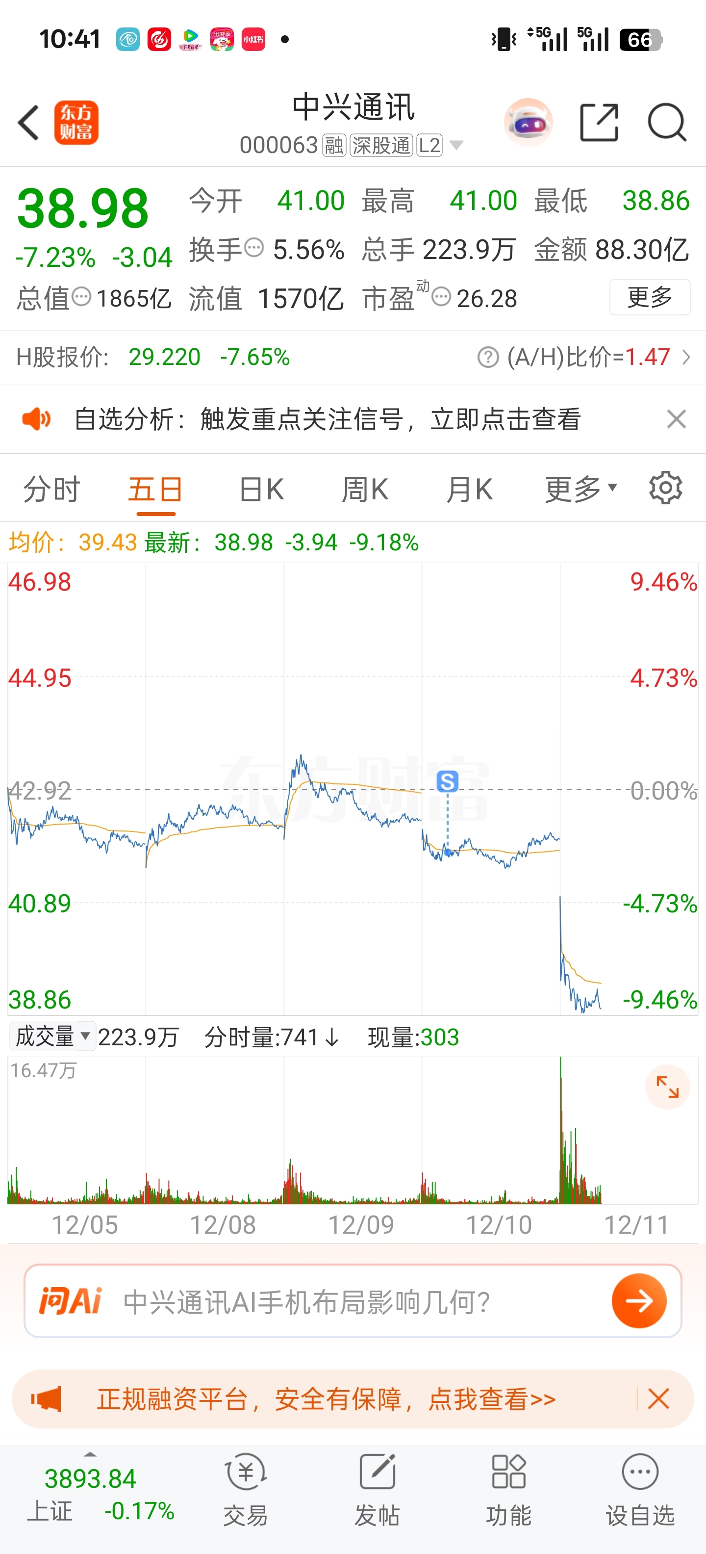 $中兴通讯(SZ000063)$ 四天后36.5元接回