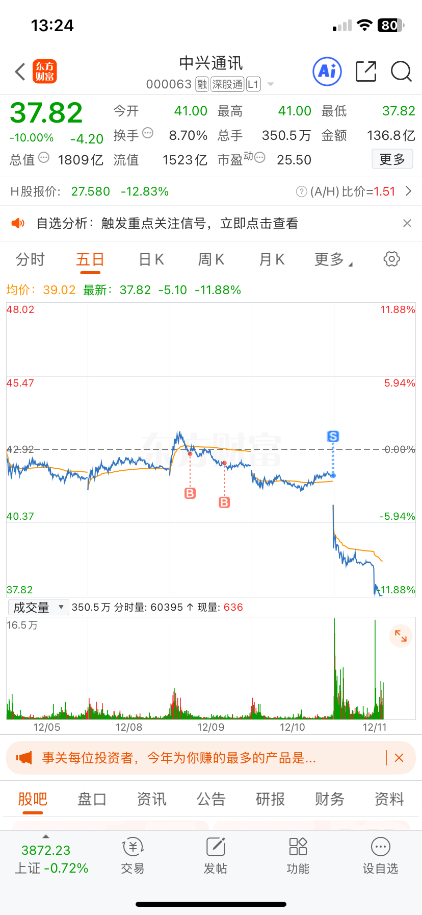 $中兴通讯(SZ000063)$ 吓哭了