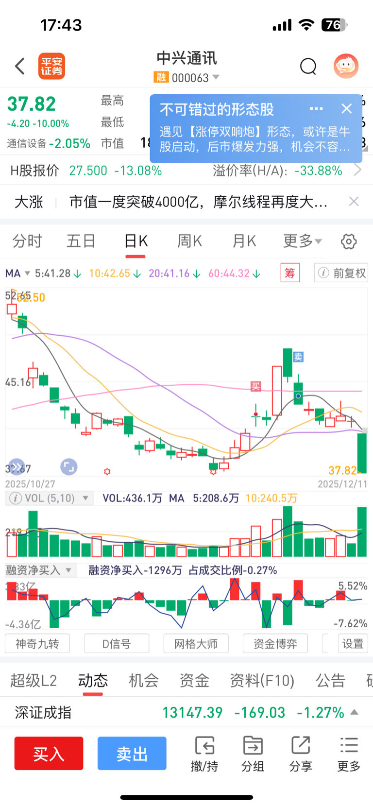 $中兴通讯(SZ000063)$ 差点吃大面。