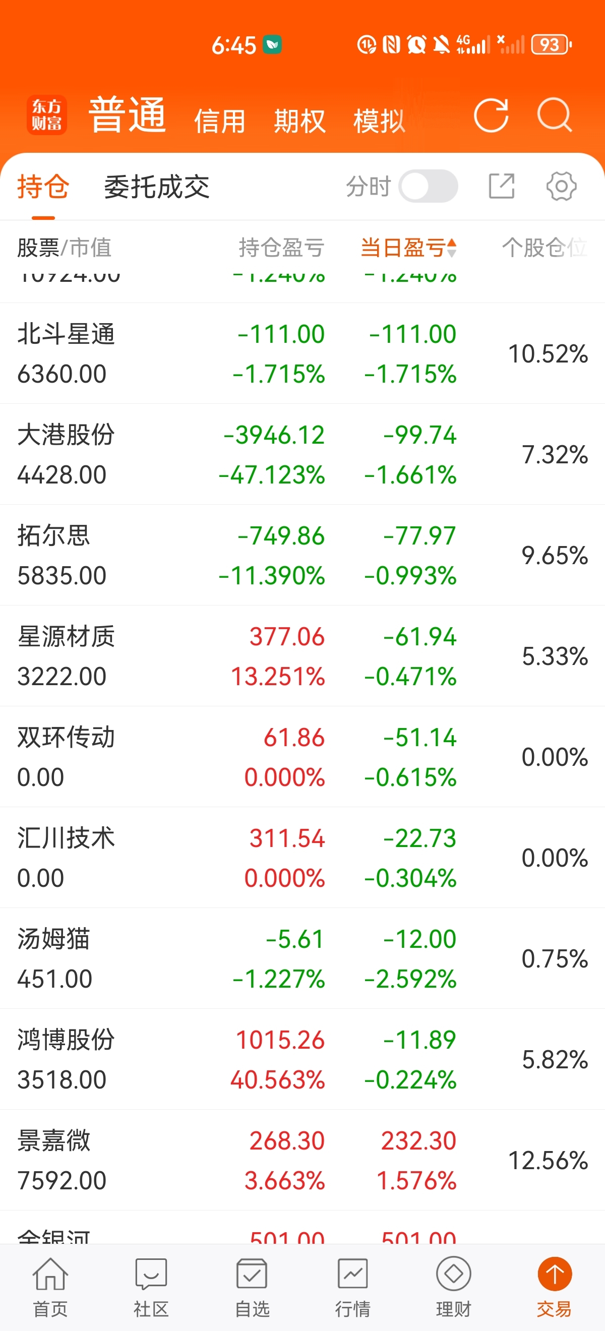 复盘看下到底是什么在亏钱出去今天早盘开盘跑的中兴亏的比较多,追高的北斗被套,追高的五洲新春被套,追高金银河盈利,做T景嘉微盈利,走掉汇川技术双环传动都没问题。低吸大港 拓尔思被套。鸿博做t没赚。总结下来追强势的新高都被套。追的箱体赚钱。砍仓的中兴跑的很好。做t的赚钱 。低吸的不行。以后不做低吸咯越吸越低!新高也不去了。只做t和做箱体了