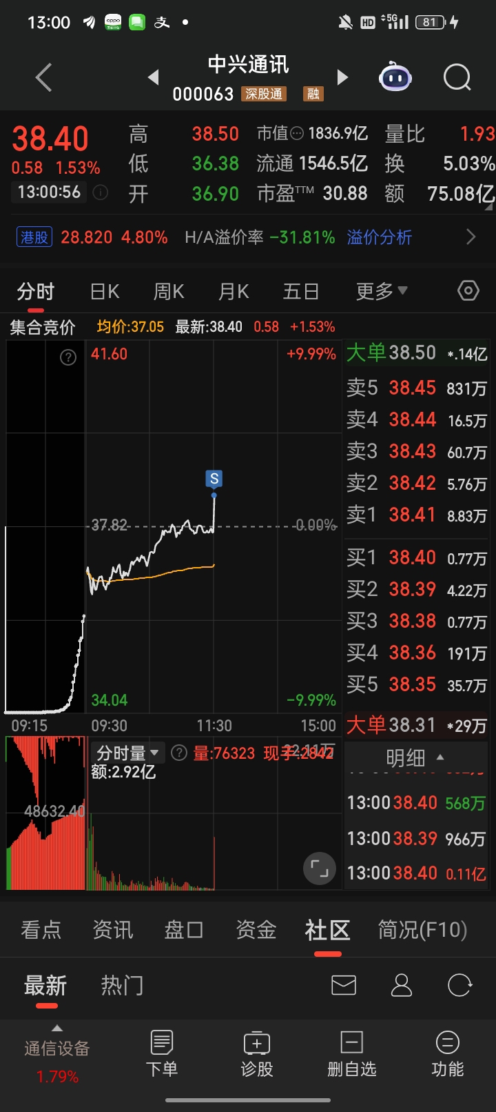 $中兴通讯(SZ000063)$ 有没有卖飞啊