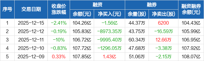 中兴通讯融资融券信息显示,2025年12月15日融资净偿还1.56亿元;融资余额104.26亿元,较前一日下降1.48%。
