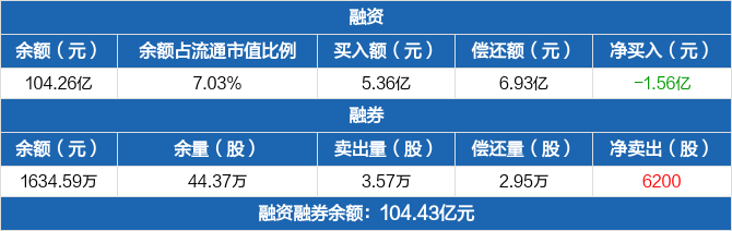 融资方面,当日融资买入5.36亿元,融资偿还6.93亿元,融资净偿还1.56亿元,净偿还额两市排名第十,连续4日净偿还累计3.59亿元。融券方面,融券卖出3.57万股,融券偿还2.95万股,融券余量44.37万股,融券余额1634.59万元。融资融券余额合计104.43亿元。