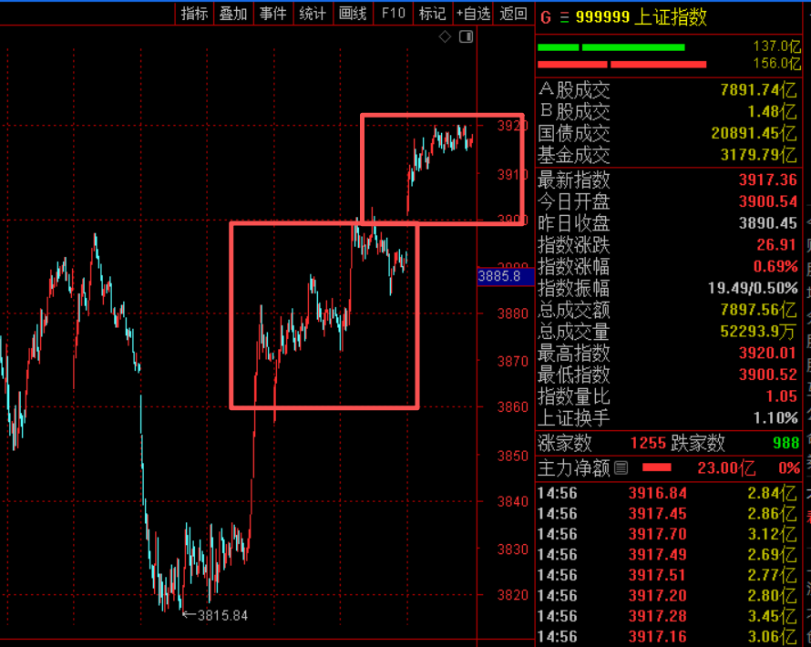 今天指数五分钟的走势,早盘就突破了五分钟的中枢结构,早盘跳空高开站稳了3900点上方,今天也是全天呈现了震荡的姿态,现在指数正在运行缠论的第二个中枢,走势上唯独就一个瑕疵,就是成交量没有持续的放大,指数持续走强的概率应该是不大,接下来指数的走势维持震荡的格局吧。