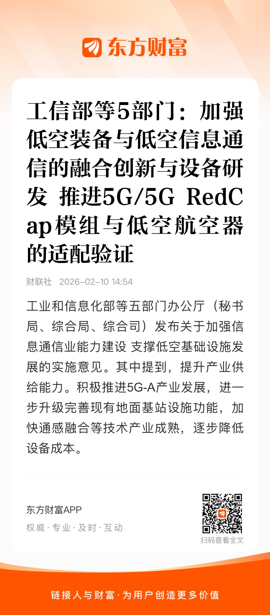 工业和信息化部等五部门办公厅(秘书局、综合局、综合司)发布关于加强信息通信业能力建设 支撑低空基础设施发展的实施意见。其中提到,提升产业供给能力。积极推进5G-A产业发展,进一步升级完善现有地面基站设施功能,加快通感融合等技术产业成熟,逐步降低设备成本。加强低空装备与低空信息通信的融合创新与设备研发,推进5G/5G RedCap模组与低空航空器的适配验证。探索低空通信、导航、监视功能融合模组研发,加速技术和产业成熟。