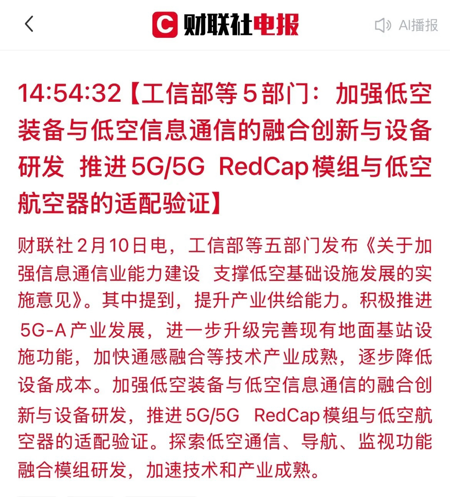 文件要求推进5G/5G RedCap通信模组在低空航空器中的适配验证。这意味着未来各类飞行器必须搭载高性能通信模组,为物联网通信厂商打开新的百亿级市场。