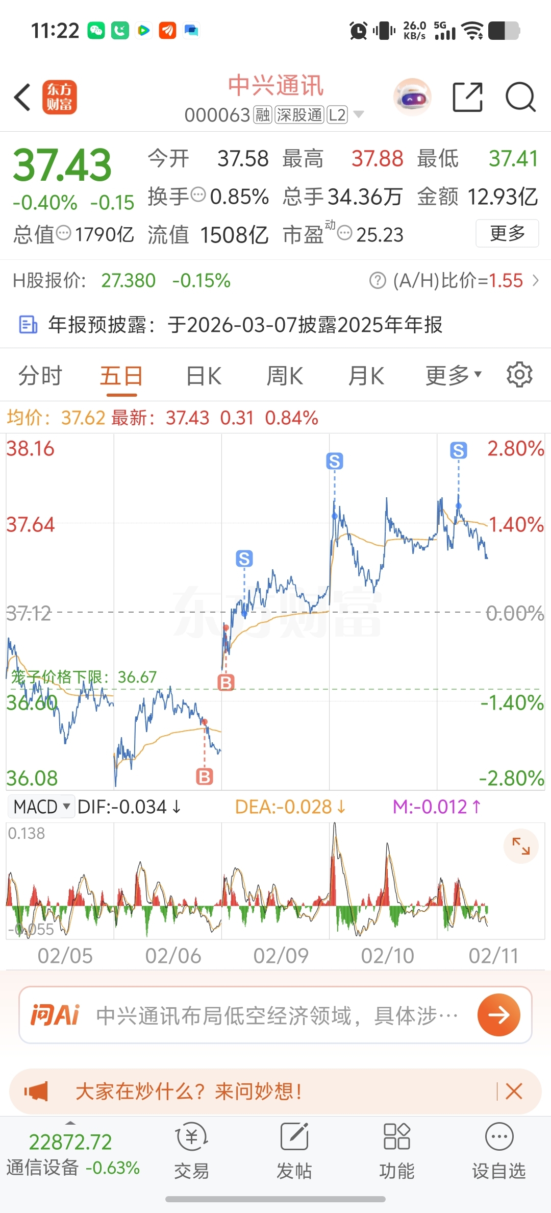 $中兴通讯(SZ000063)$ 先撤了,等低位