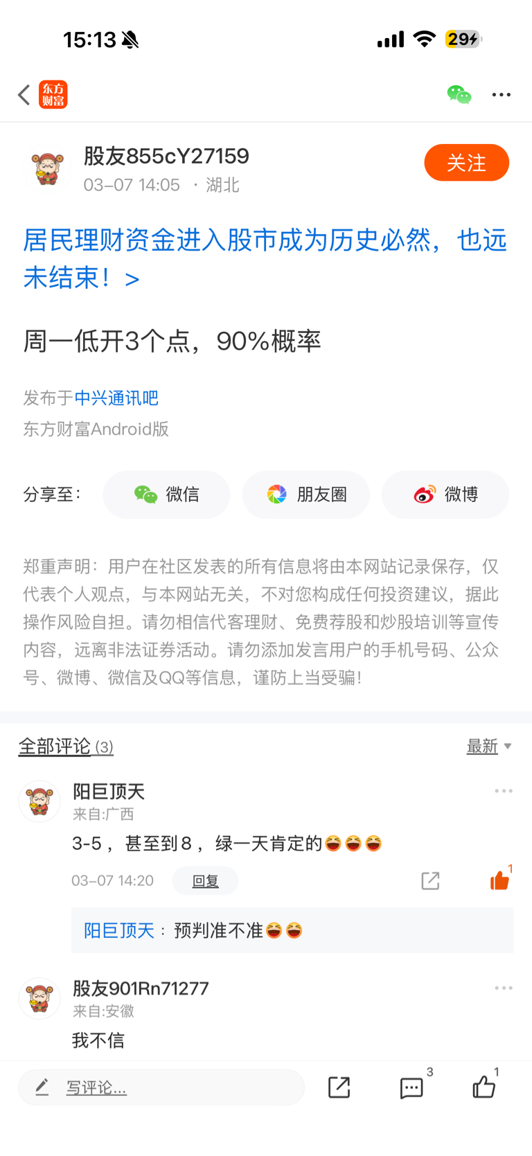温馨提示: 1.根据《证券法》规定,禁止编造、传播虚假信息或者误导性信息,扰乱证券市场;2.用户在本社区发表的所有资料、言论等仅代表个人观点,与本网站立场无关,不对您构成任何投资建议。用户应基于自己的独立判断,自行决定证券投资并承担相应风险。《东方财富社区管理规定》