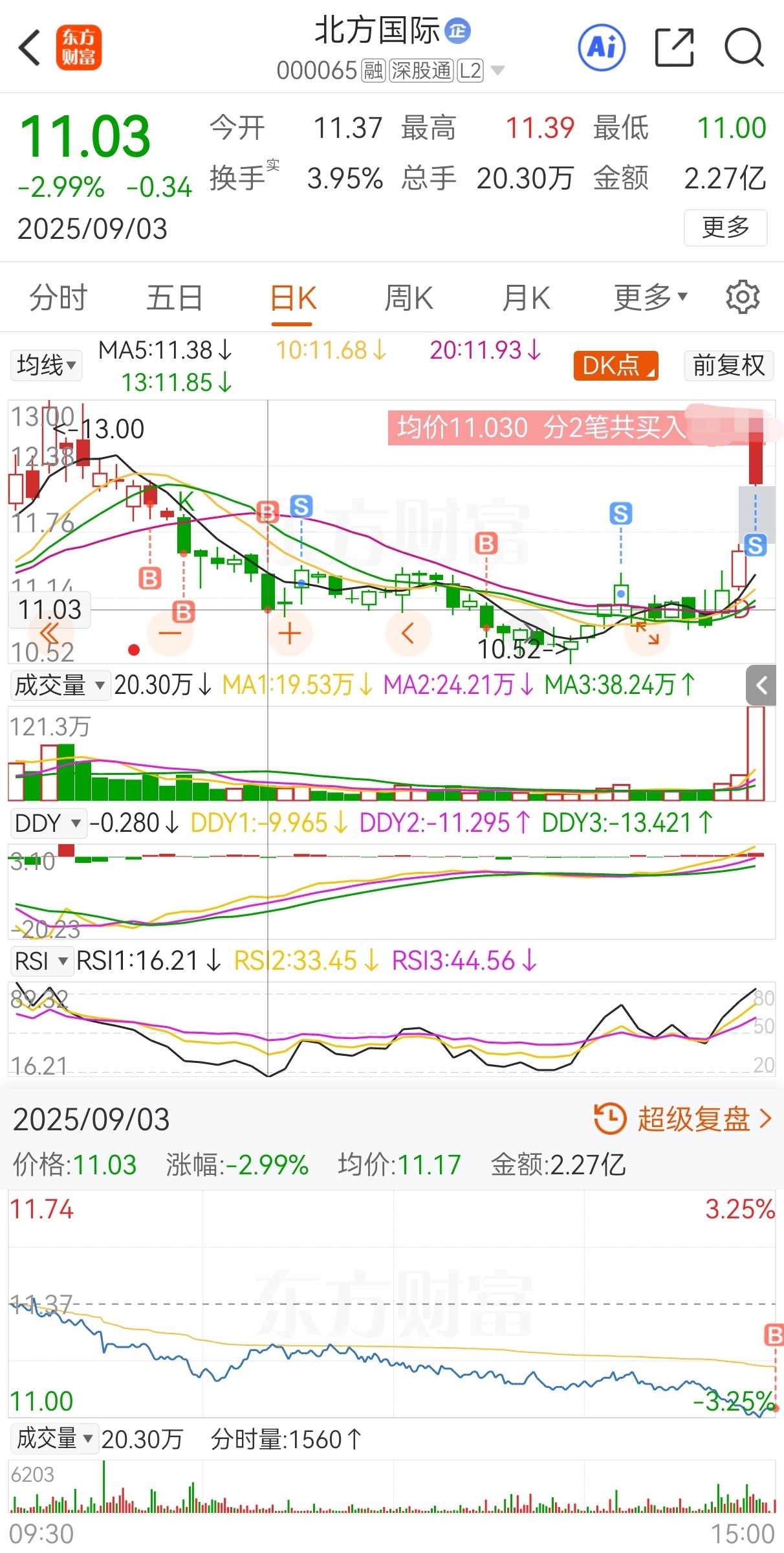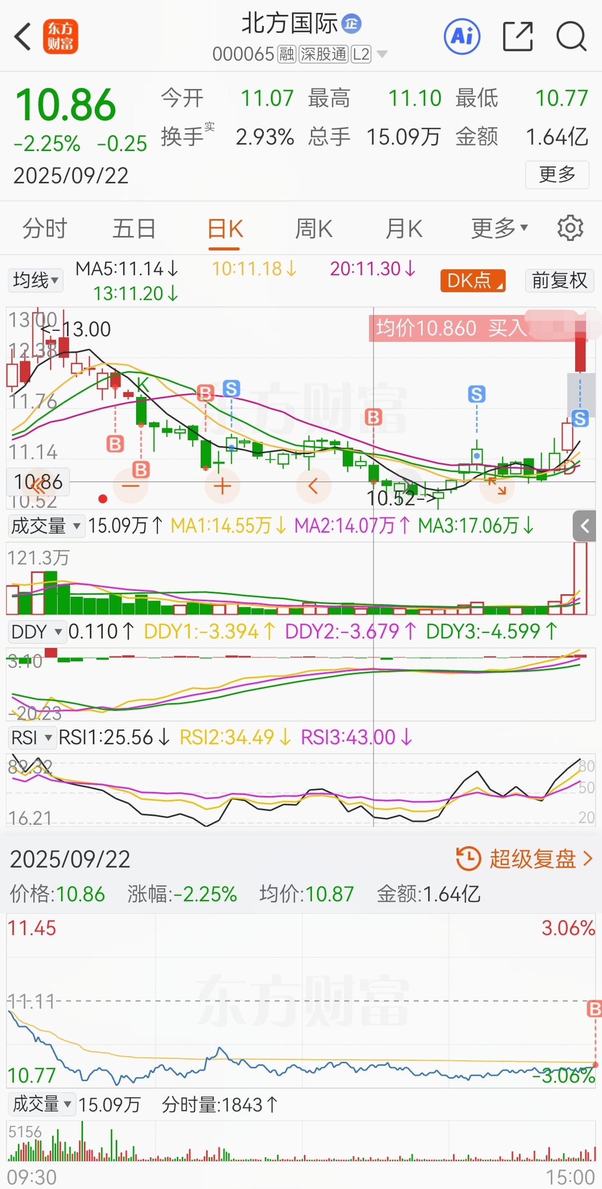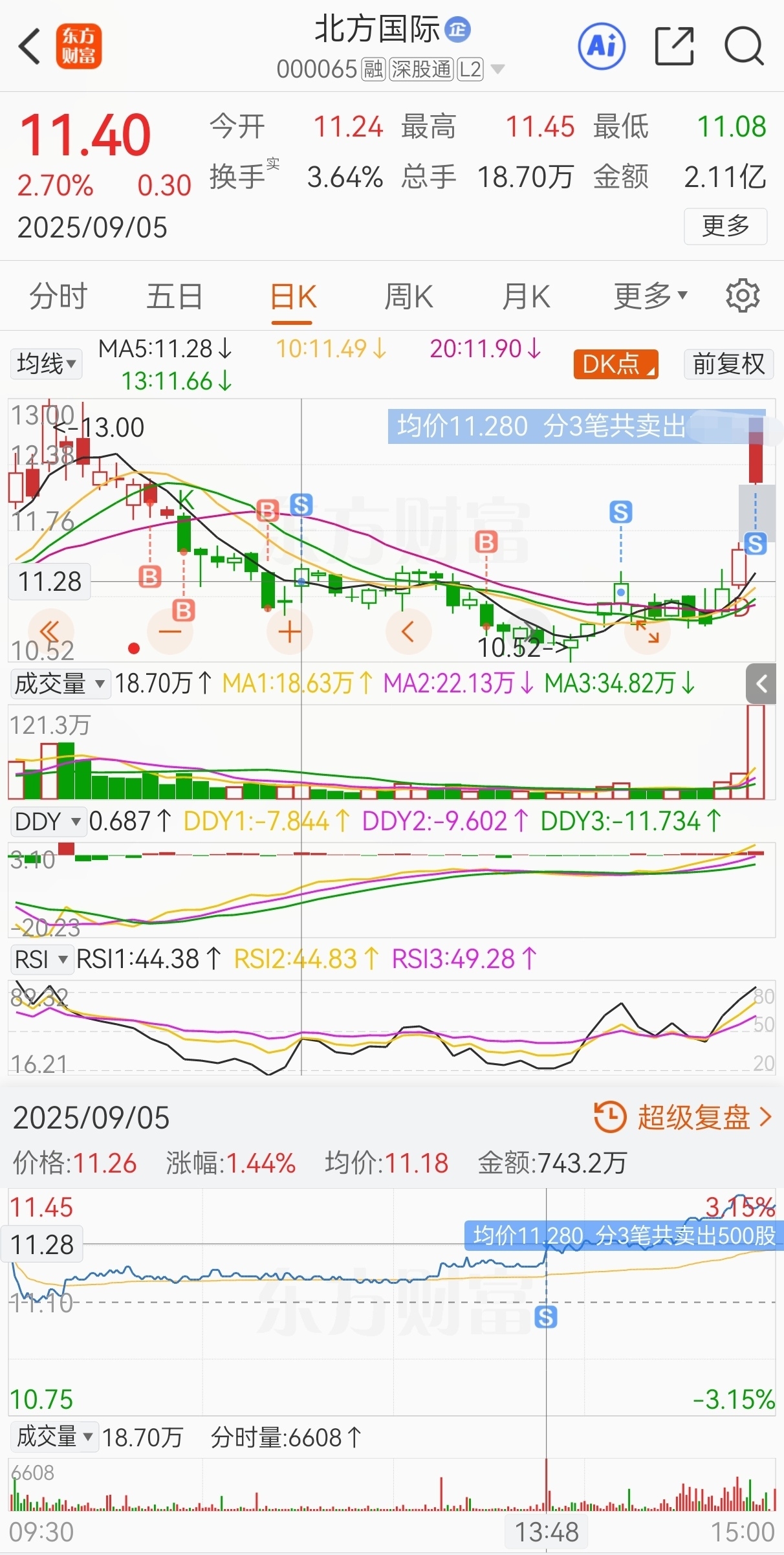 $北方国际(SZ000065)$ 原计划今买明卖,实际12.02买,11.56加仓,11.03再加仓,11.28减仓,10.86继续加仓,11.18再减仓,12.74卖,实盘短线套利北方国际,成功收米走人!