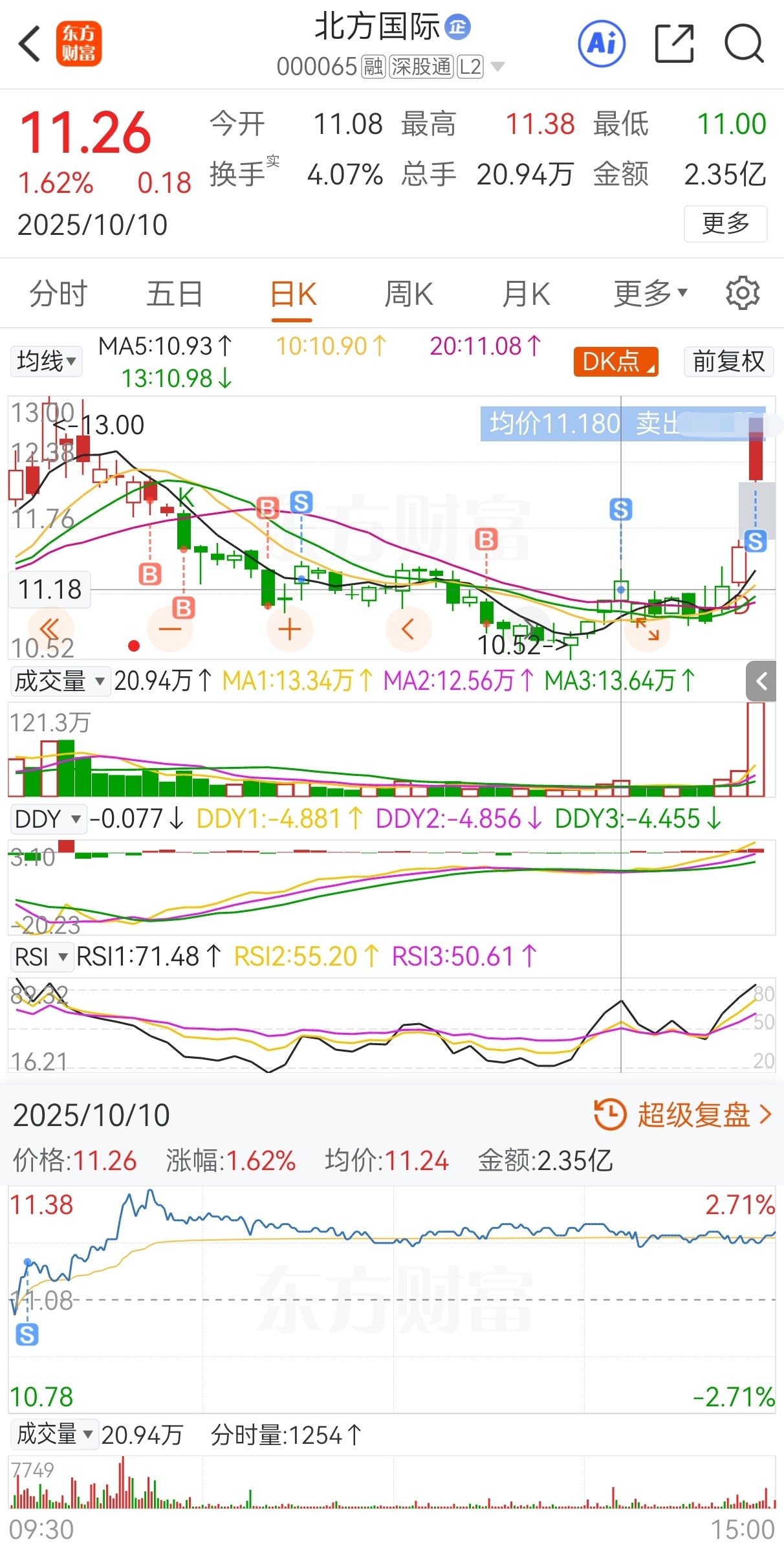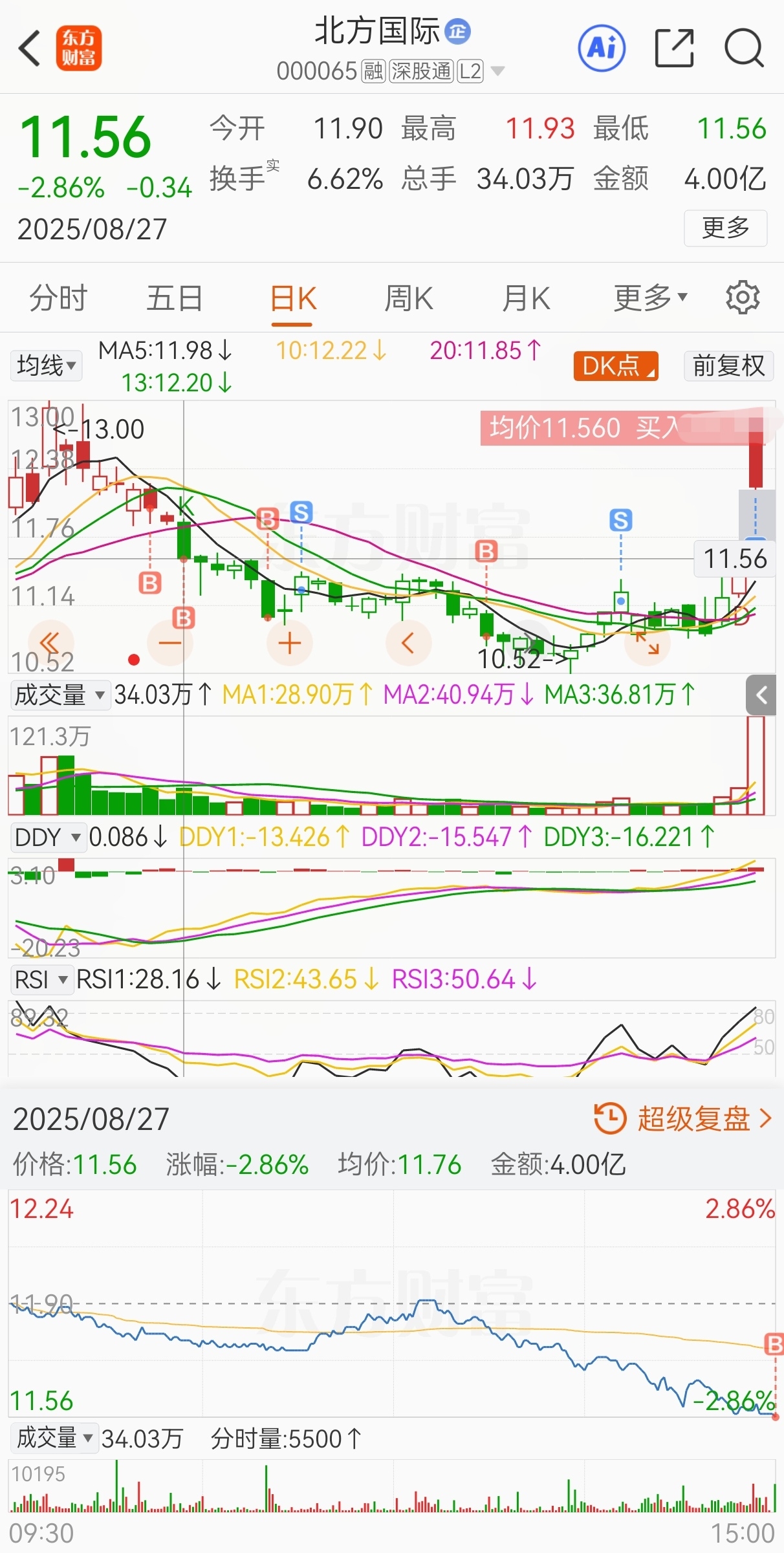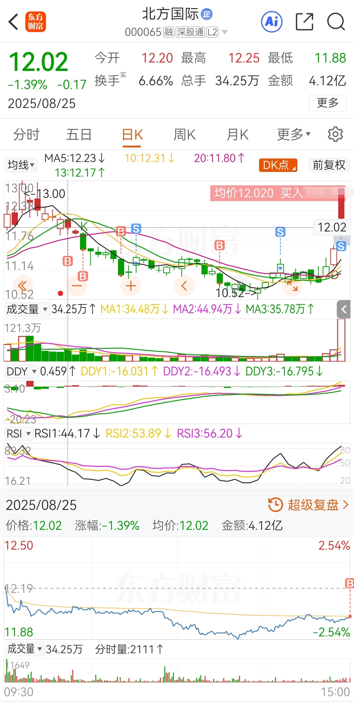 $北方国际(SZ000065)$ 原计划今买明卖,实际12.02买,11.56加仓,11.03再加仓,11.28减仓,10.86继续加仓,11.18再减仓,12.74卖,实盘短线套利北方国际,成功收米走人!