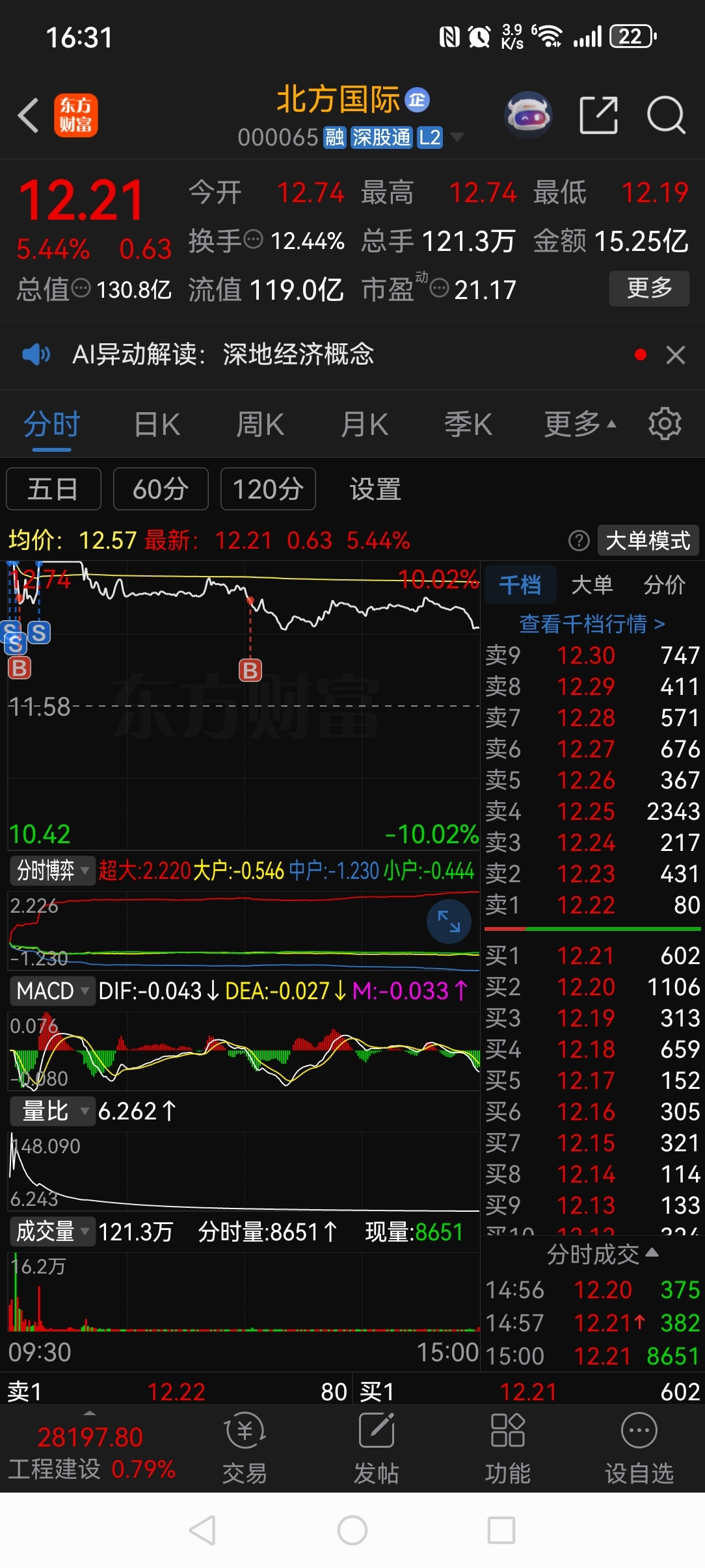 $北方国际(SZ000065)$ 今天板上卖出仓位的60%,后分两次12.44收回来卖出去的1/2。