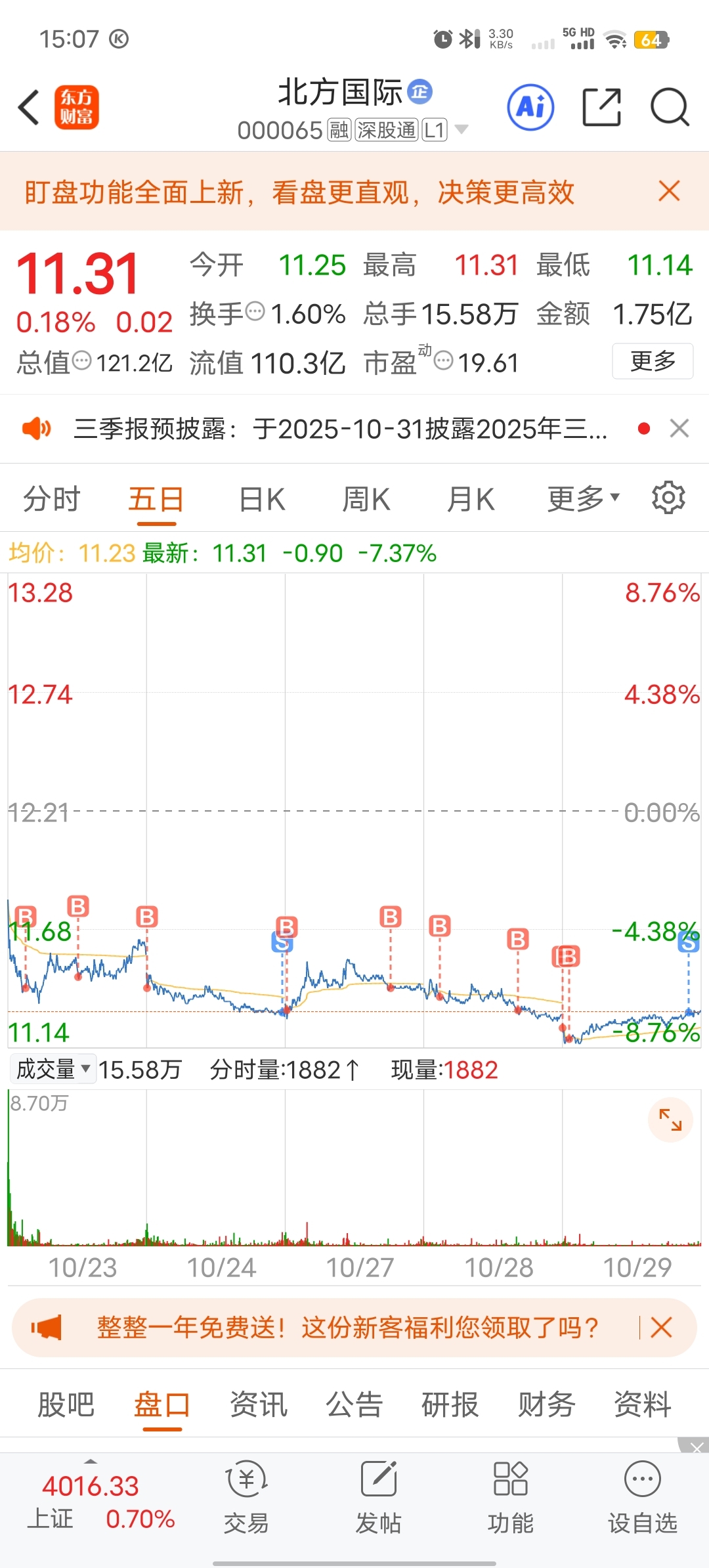 $北方国际(SZ000065)$ 刚刚T回成本线