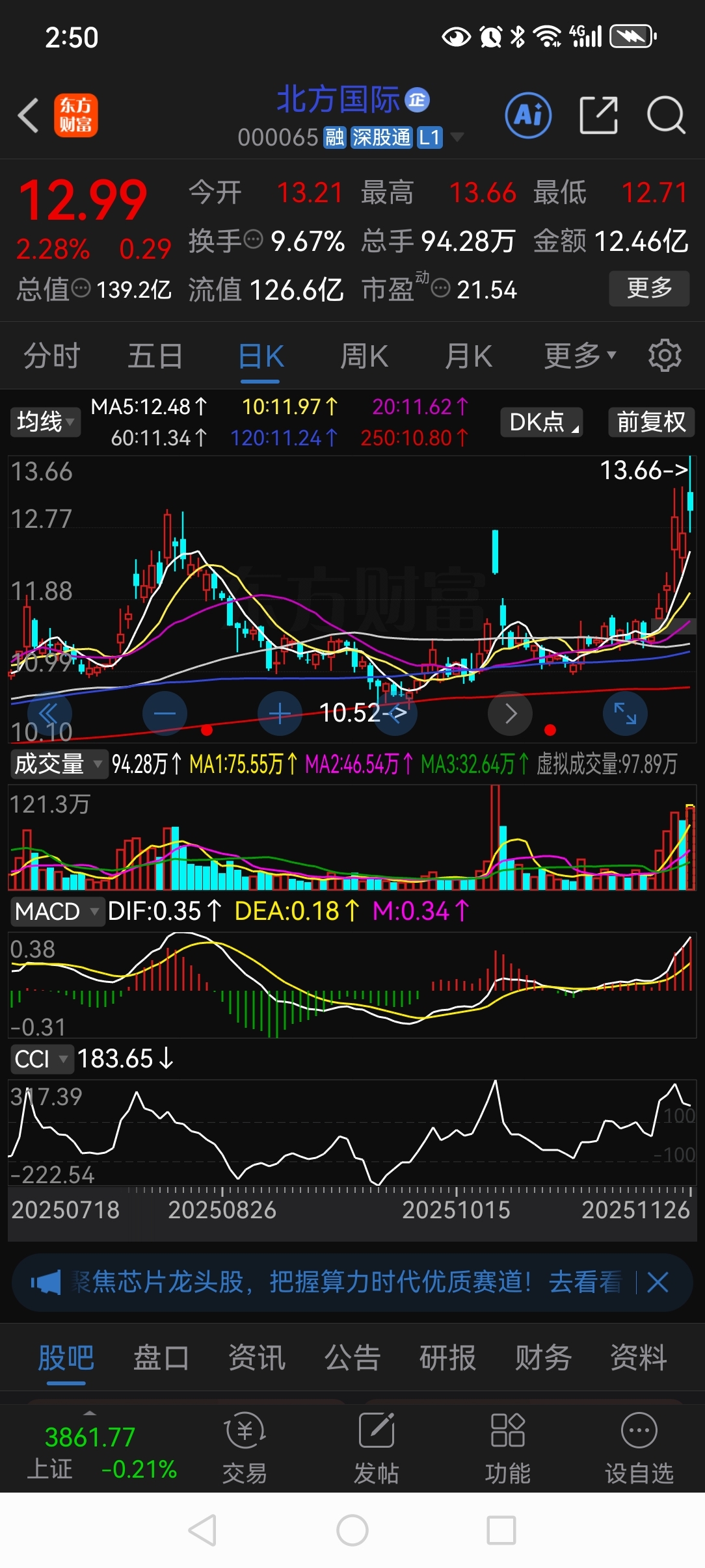 $北方国际(SZ000065)$ 真正的行情明天才开始,今天是蓄势行情。今天五日均线乖离率太大(5日均线离股价太远)今天五日均线12.5左右,开盘直接13以上。通过今天的高开低走,五日均线跟上了股价。只有五日均线跟随着股价才能走出健康的行情。这种五日均线斜率这么高的走势,接近五日均线就是买点。明天开始大阳线。立帖为证