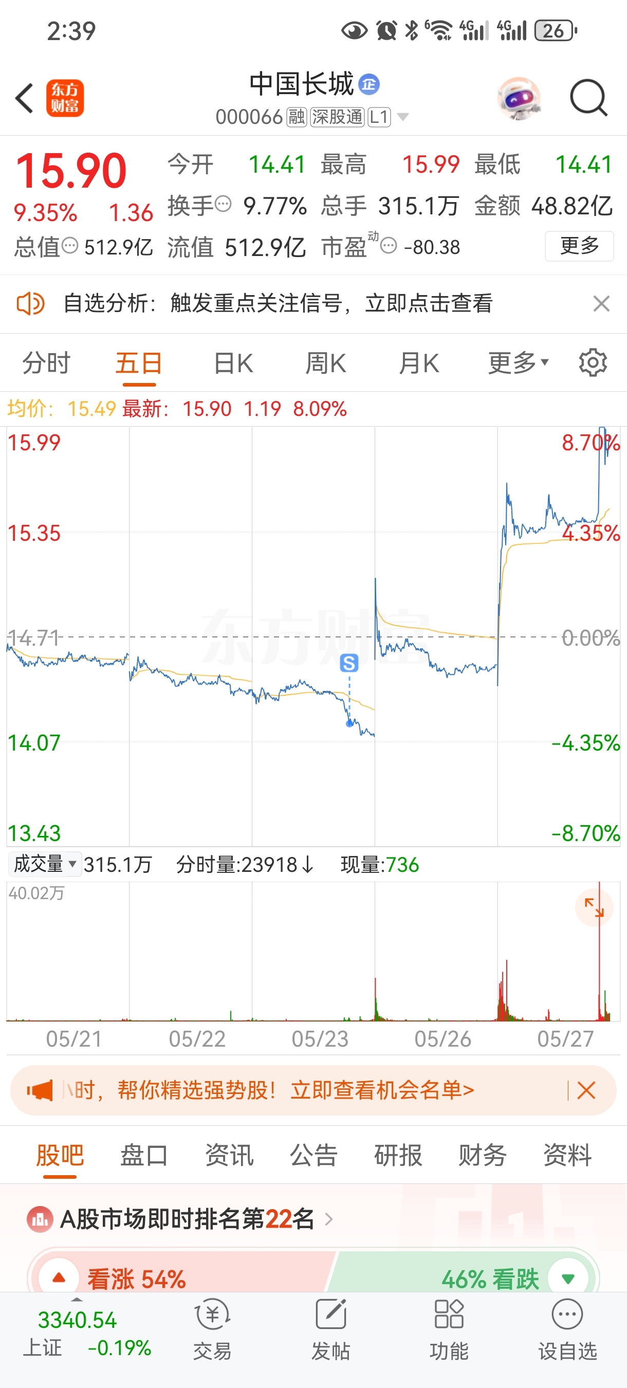 $中国长城(SZ000066)$ 疯了,上周五尾盘大跌,我出来了,这两天疯了