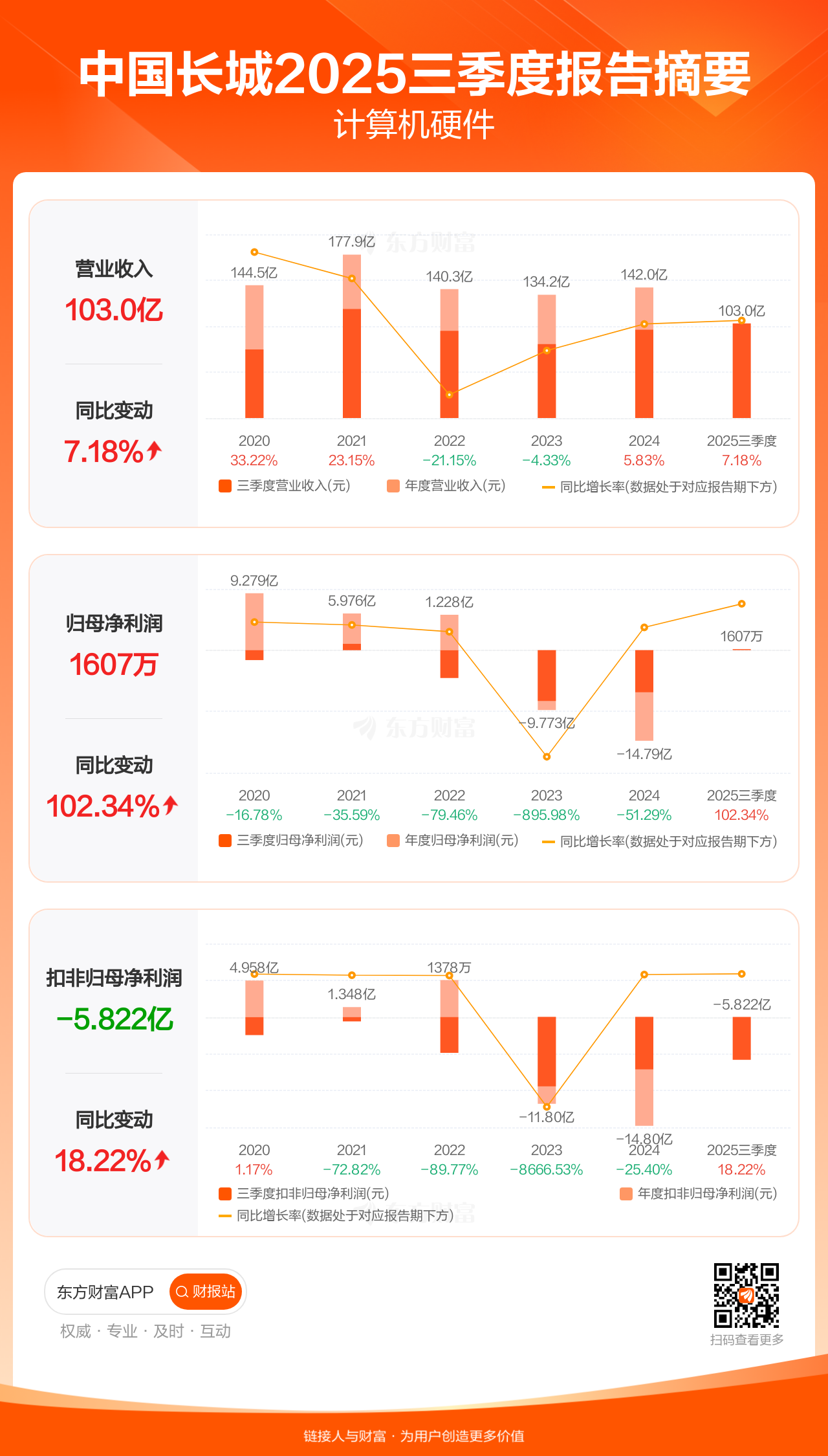 中国长城10月30日发布2025年三季报显示,公司前三季实现营业收入102.95亿元,同比增长7.18%;归母净利润1606.67万元,同比增长102.34%;扣非归母净利润-5.82亿元。