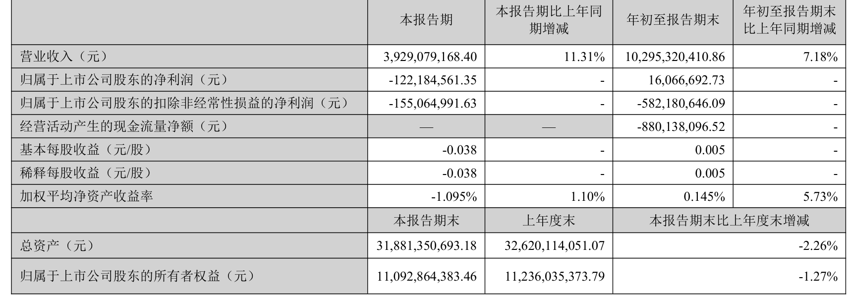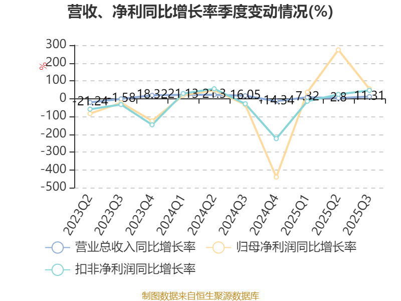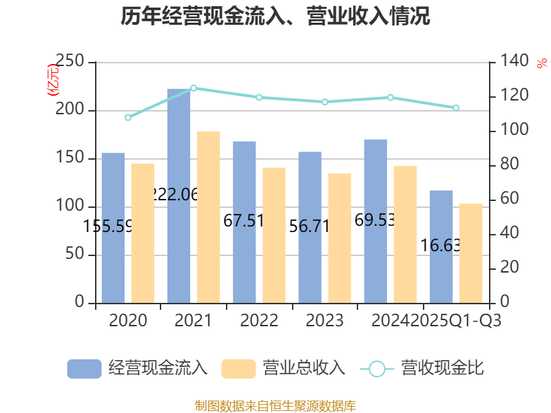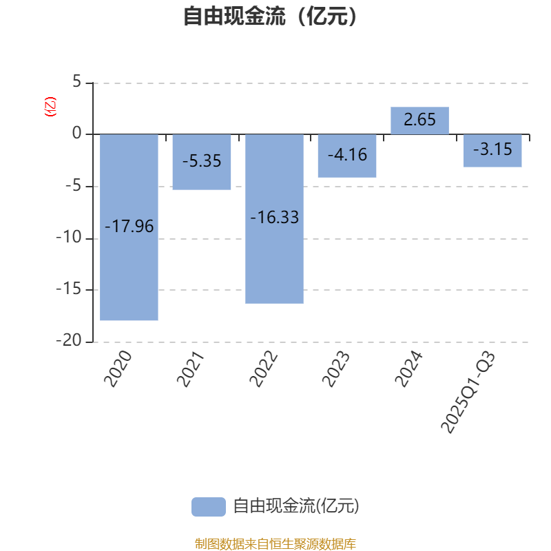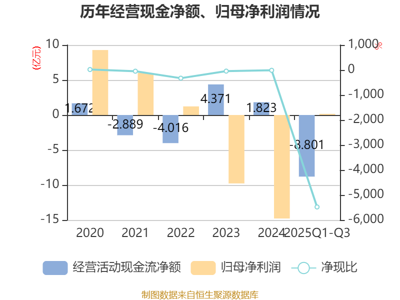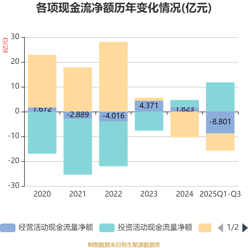 2025年前三季度,公司经营活动现金流净额为-8.8亿元,同比减少870.87万元;筹资活动现金流净额-6.97亿元,同比减少6.3亿元;投资活动现金流净额11.77亿元,上年同期为10.79亿元。