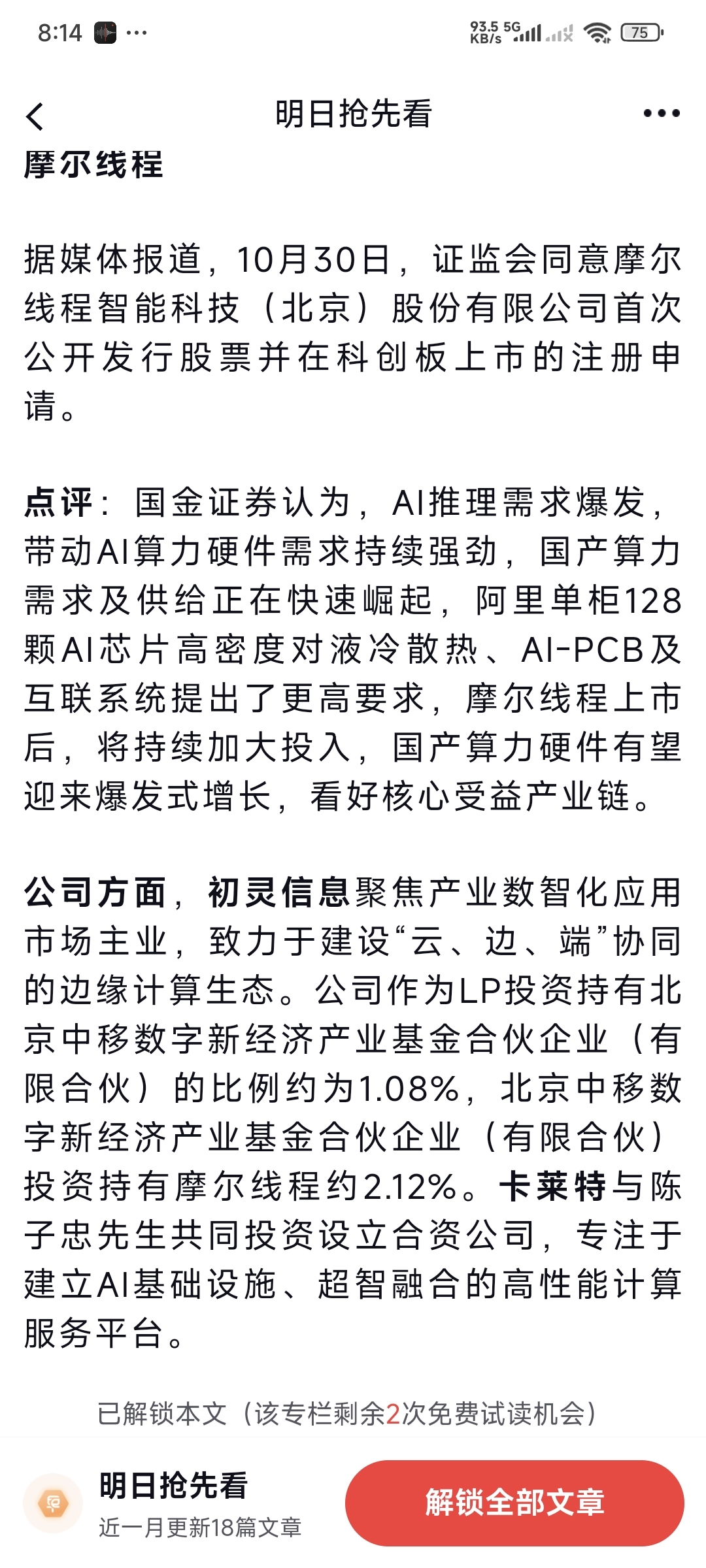 $中国长城(SZ000066)$ 昨天盘后通过了摩尔线程ipo申请。对中国长城是大利好吗?