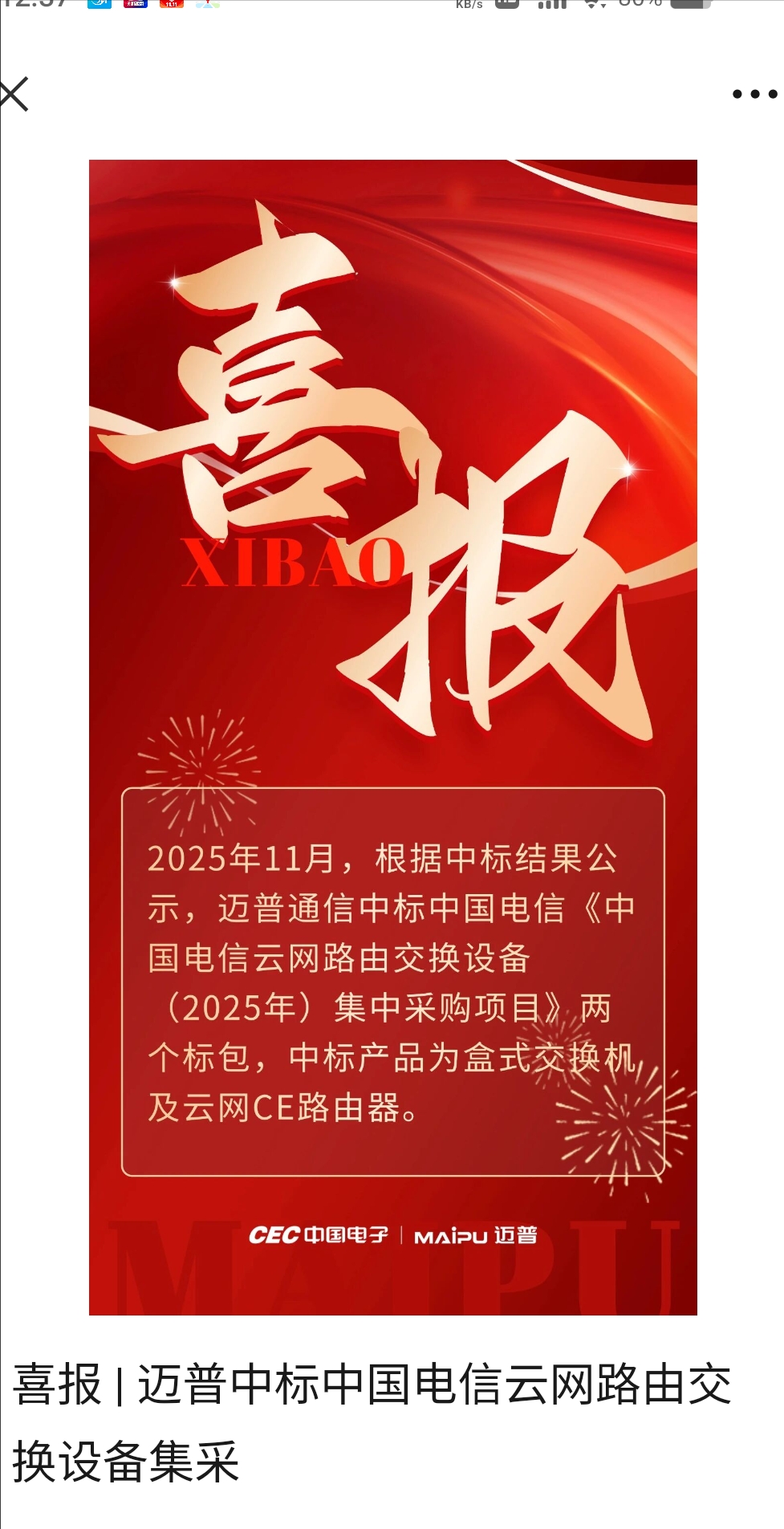 $中国长城(SZ000066)$ 喜报 | 迈普中标中国电信云网路由交换设备集采