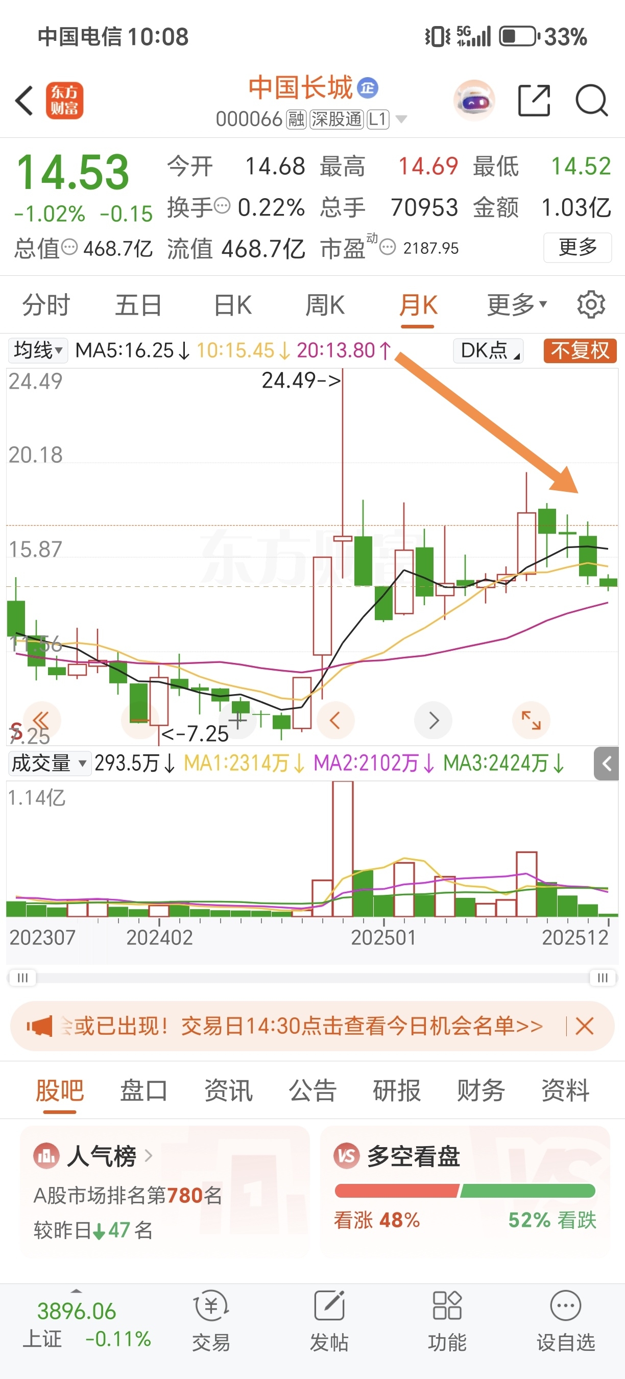 $中国长城(SZ000066)$ 月线四连杀,20个点!!这票算废了