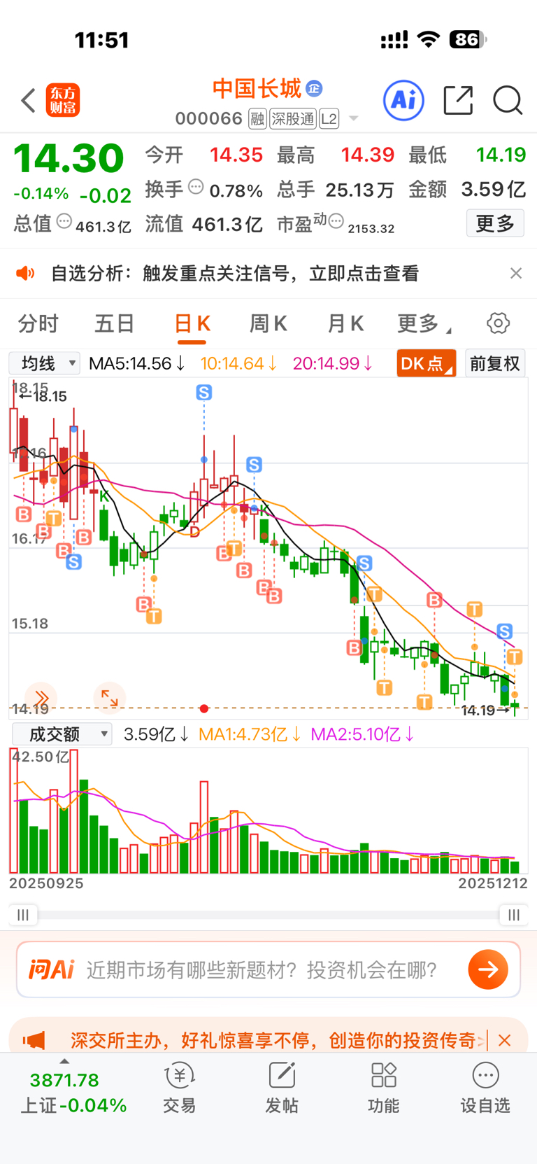 $中国长城(SZ000066)$ 昨天14.5卖了2万股买了京泉华今天赚了9个点跑了,操作好先卖了回调再买回来可以挣到1 6个点。可怜的长城,哎