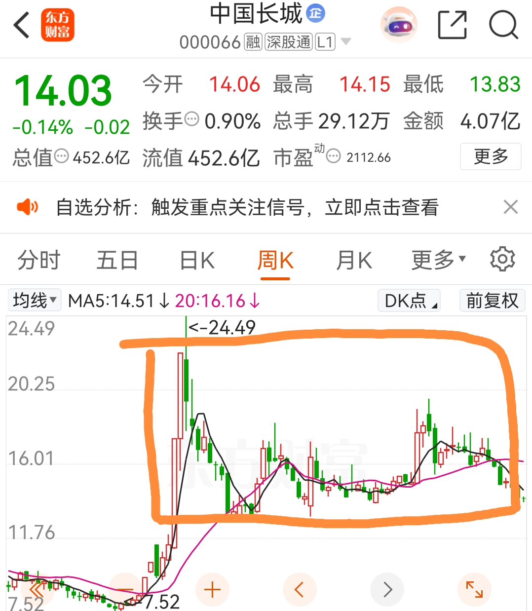 周线,最有说服力,14一定不能破,或者说收盘一定要14之上
