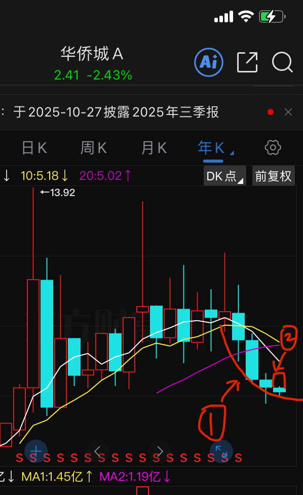 还有三个月年k完。 1号接着挖坑做圆弧。2号往上拉。 做圆弧的可能性更大。 他今年的k开场就是下台阶形态,就是圆弧形态。如果他趋势想走好。年k开场平开都是可以。但不是。