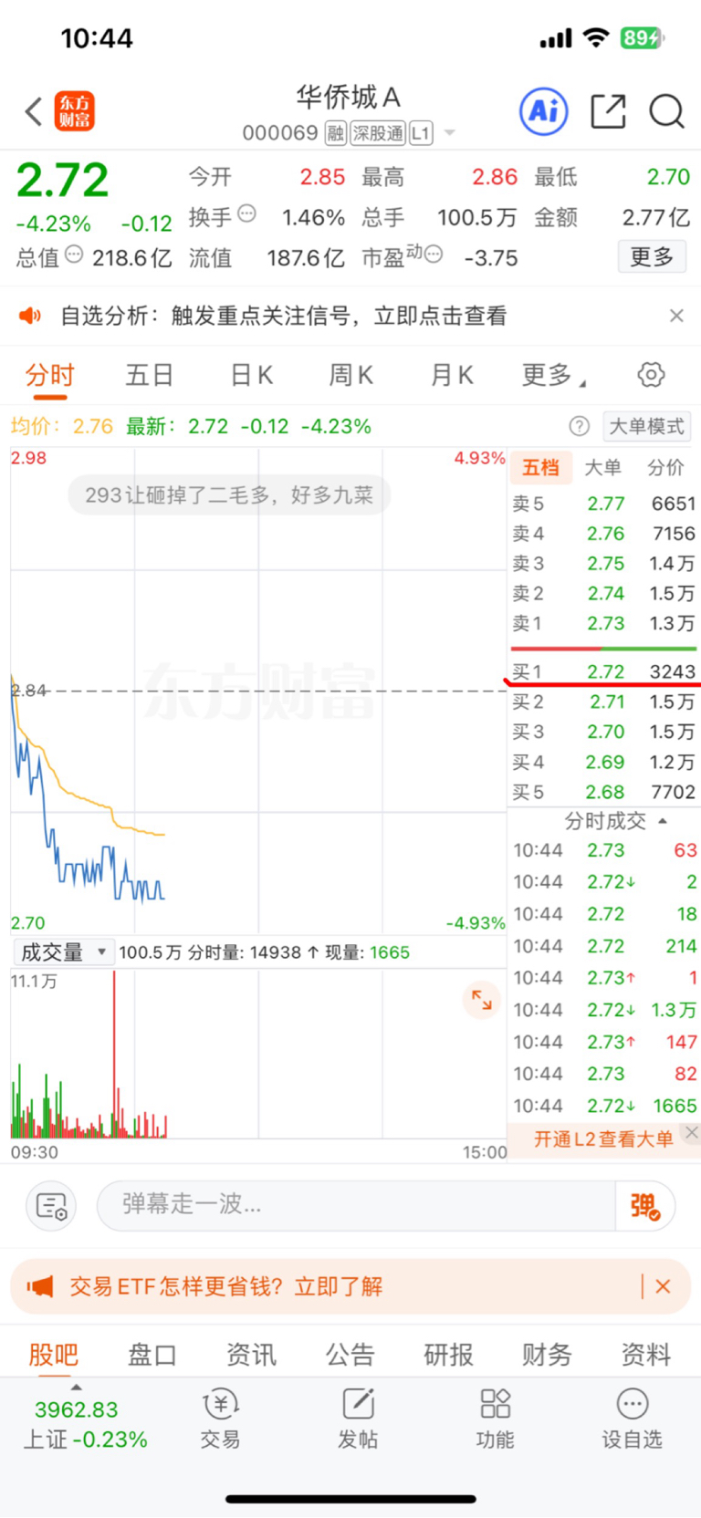 2.72元机构挂虚假买单,引诱散户抄底,散户挂买单,机构马上撤单,让散户成交。机