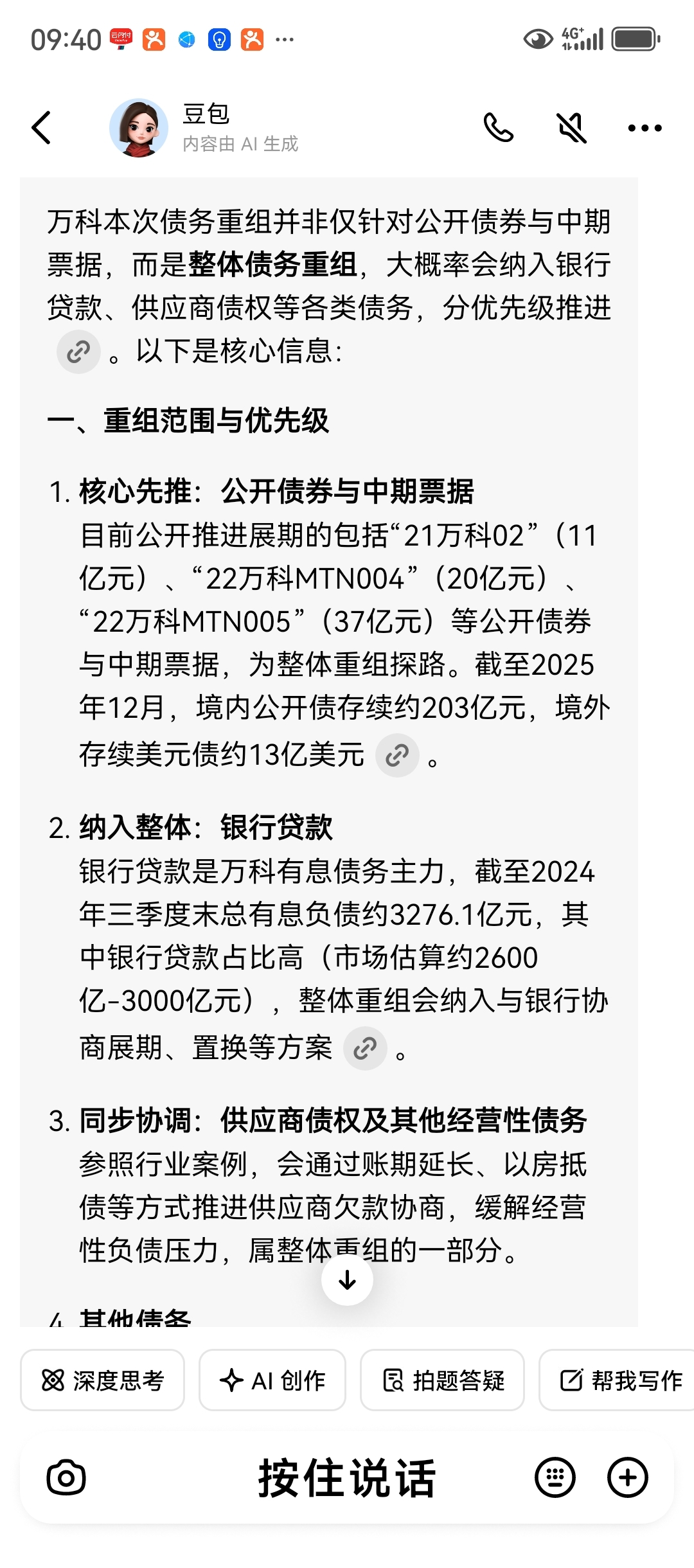 豆包提供的万科债务重组方案。二手房价回到2010年,房地产去杠杆已是扫尾巴阶段,