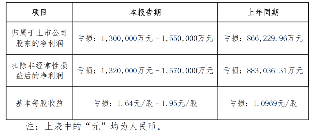 公告显示,2025年预计归属于上市公司股东的净利润亏损约130亿元-155亿元,2024年同期亏损约86.6亿元;扣除非经常性损益后的净利润亏损约132亿元-157亿元,2024年同期亏损约88.3亿元。