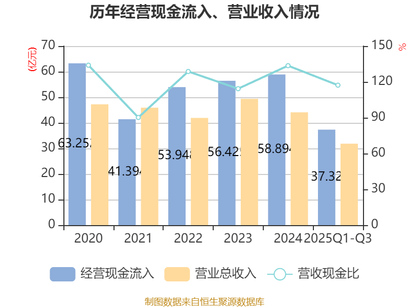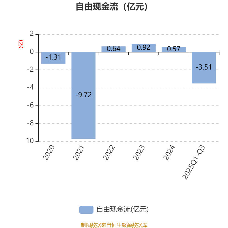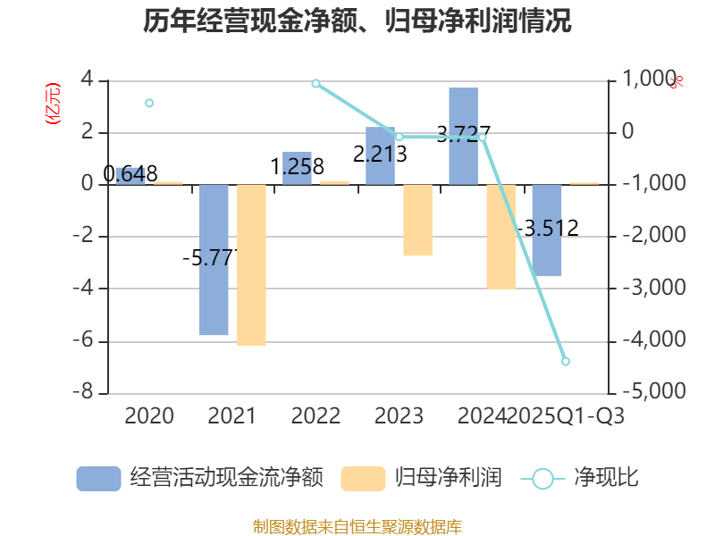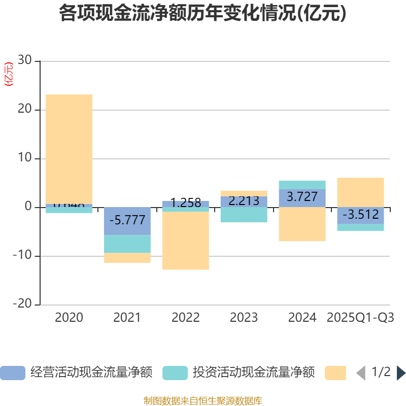 2025年前三季度,公司经营活动现金流净额为-3.51亿元,同比减少4.97亿元;筹资活动现金流净额6.02亿元,同比增加7237.87万元;投资活动现金流净额-1.38亿元,上年同期为-4.64亿元。