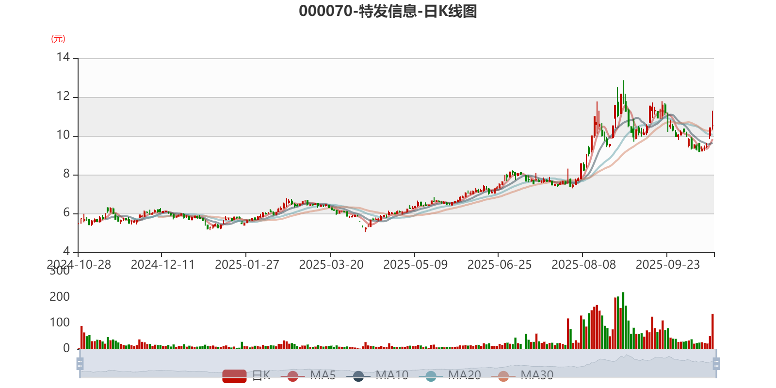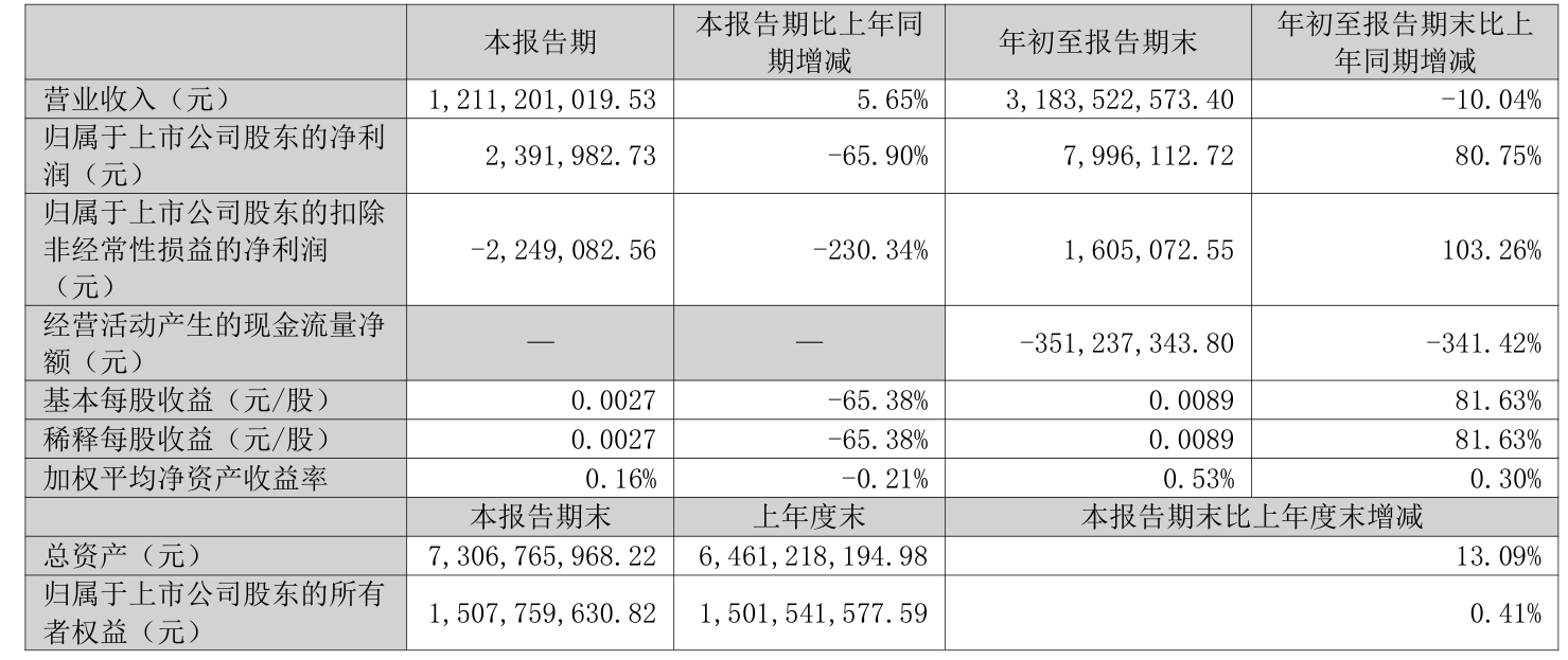 中证智能财讯特发信息(000070)10月27日披露2025年第三季度报告。前三季度公司实现营业总收入31.84亿元,同比下降10.04%;归母净利润799.61万元,同比增长80.75%;扣非净利润160.51万元,同比扭亏;经营活动产生的现金流量净额为-3.51亿元,上年同期为1.45亿元;报告期内,特发信息基本每股收益为0.0089元,加权平均净资产收益率为0.53%。