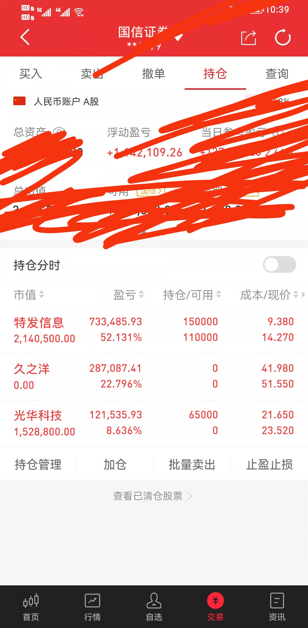 $特发信息(SZ000070)$ 大家好,更新一下今日实盘。特发信息继续持有,今天表现依旧给力持有52cm,继续加油!将久之洋止盈出局了,收获满满。新进了光华科技,希望可以延续这两支的趋势!一同进步$新 华 都(SZ002264)$