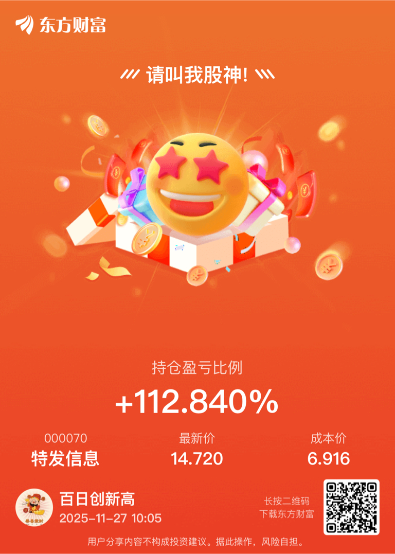 $特发信息(SZ000070)$ 今天止盈了 持股112天。最终盈利115%#收盘点评# 感谢,重新布局下一个目标