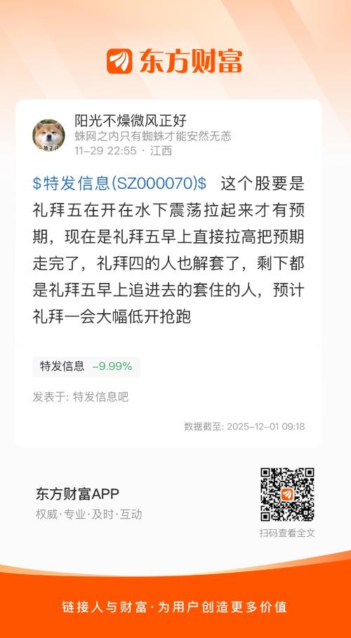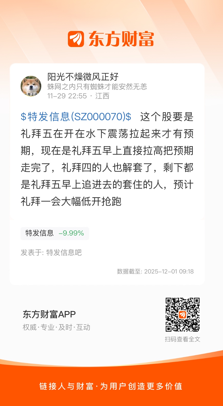 $特发信息(SZ000070)$ 这个股要是礼拜五在开在水下震荡拉起来才有预期,现在是礼拜五早上直接拉高把预期走完了,礼拜四的人也解套了,剩下都是礼拜五早上追进去的套住的人,预计礼拜一会大幅低开抢跑