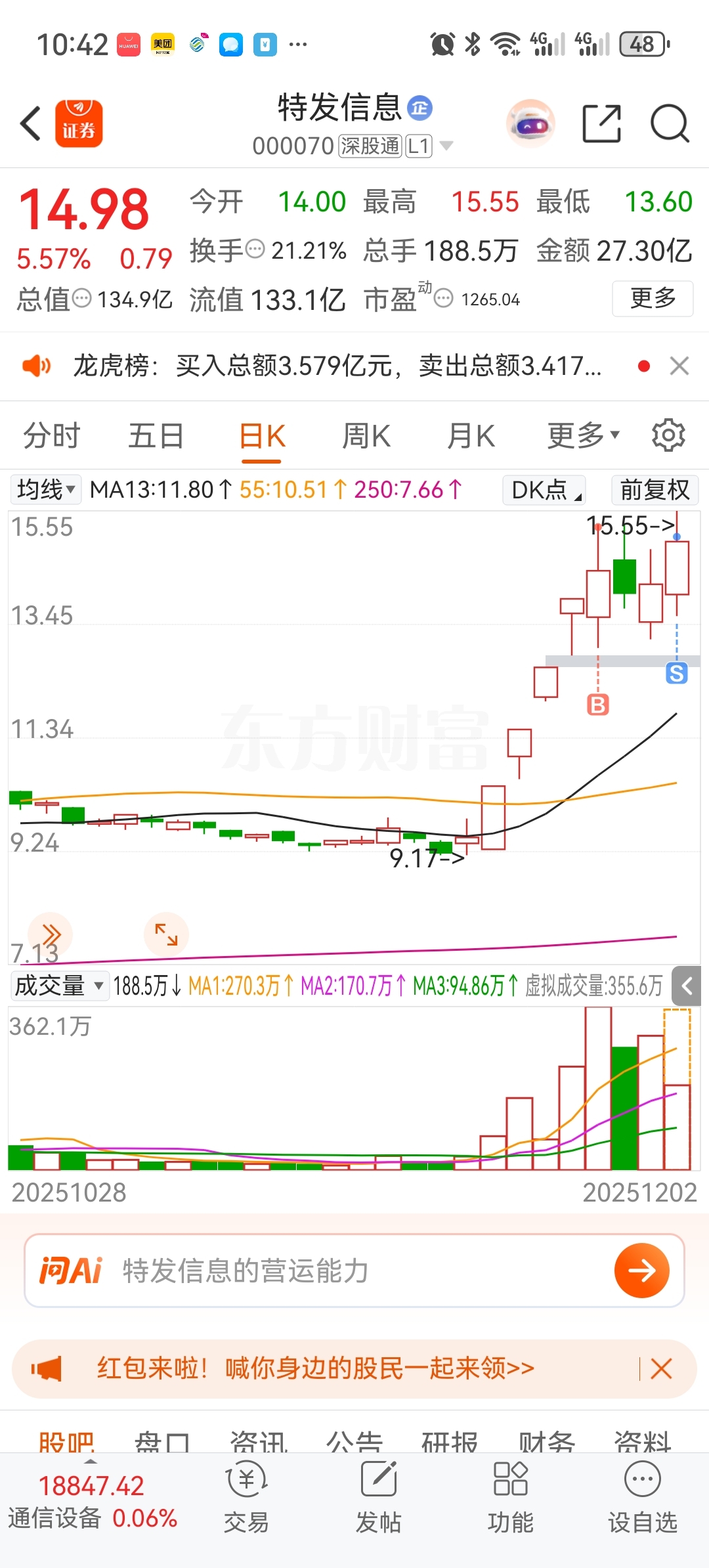 $特发信息(SZ000070)$ 15.25买,拿了几天,今天15.08亏钱卖,这走势真的看不懂,以为要涨停,今天跟赛微电子跟了一波,已经是跟屁虫了,最近核心断板的都反包,就这个货不行