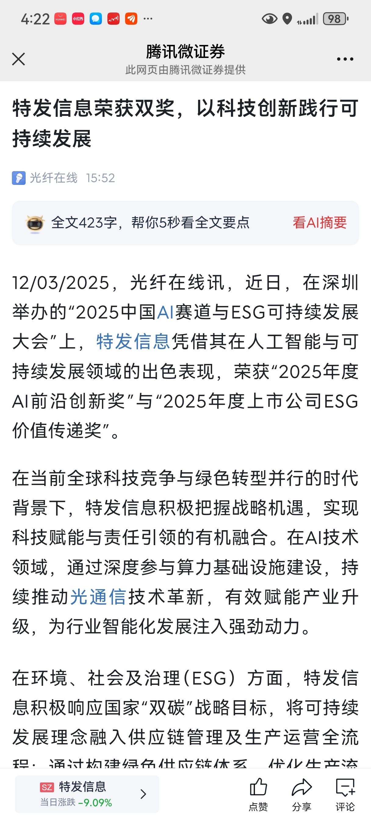 $特发信息(SZ000070)$ 兄弟得了一个牛B奖