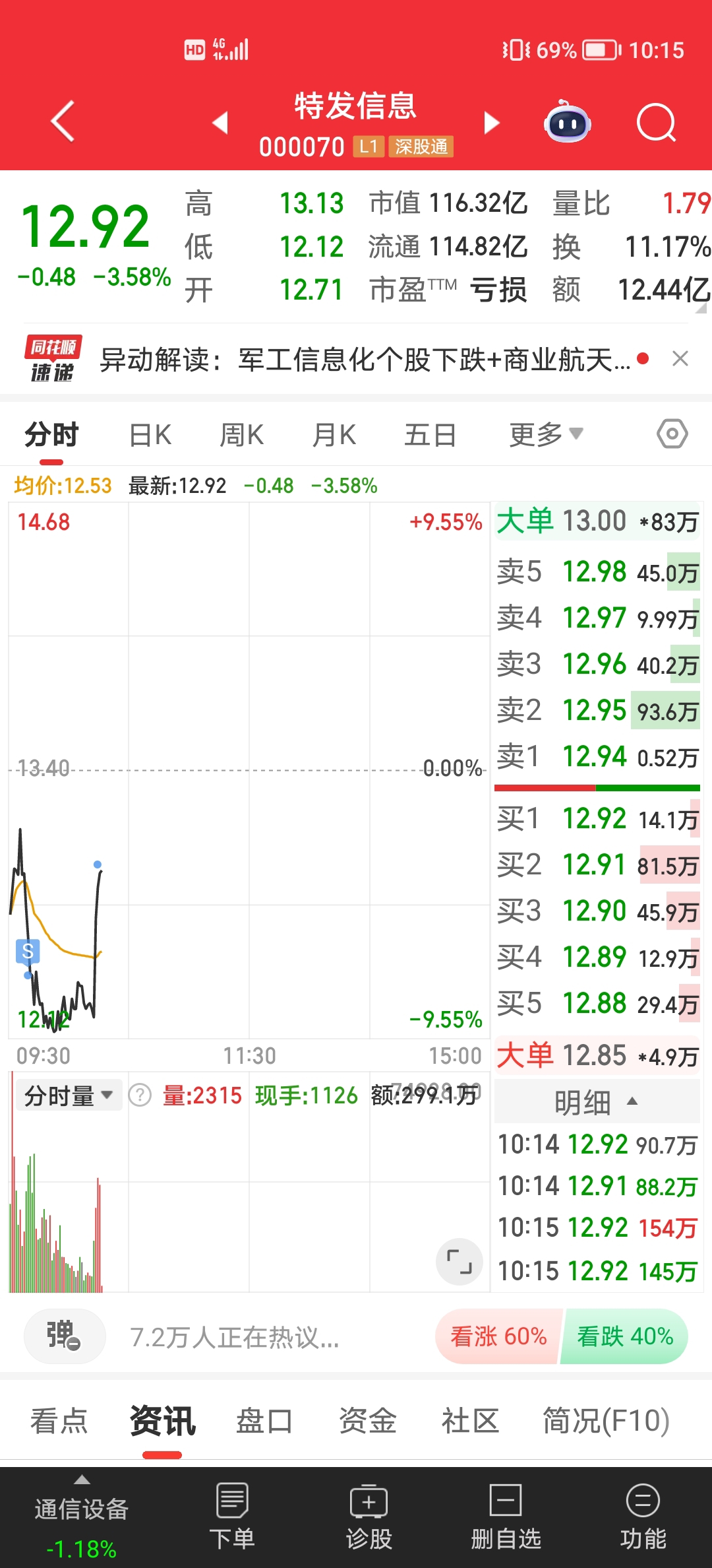 $特发信息(SZ000070)$ 12.4割肉,13接着割,割了你拉起来,你道德呢。