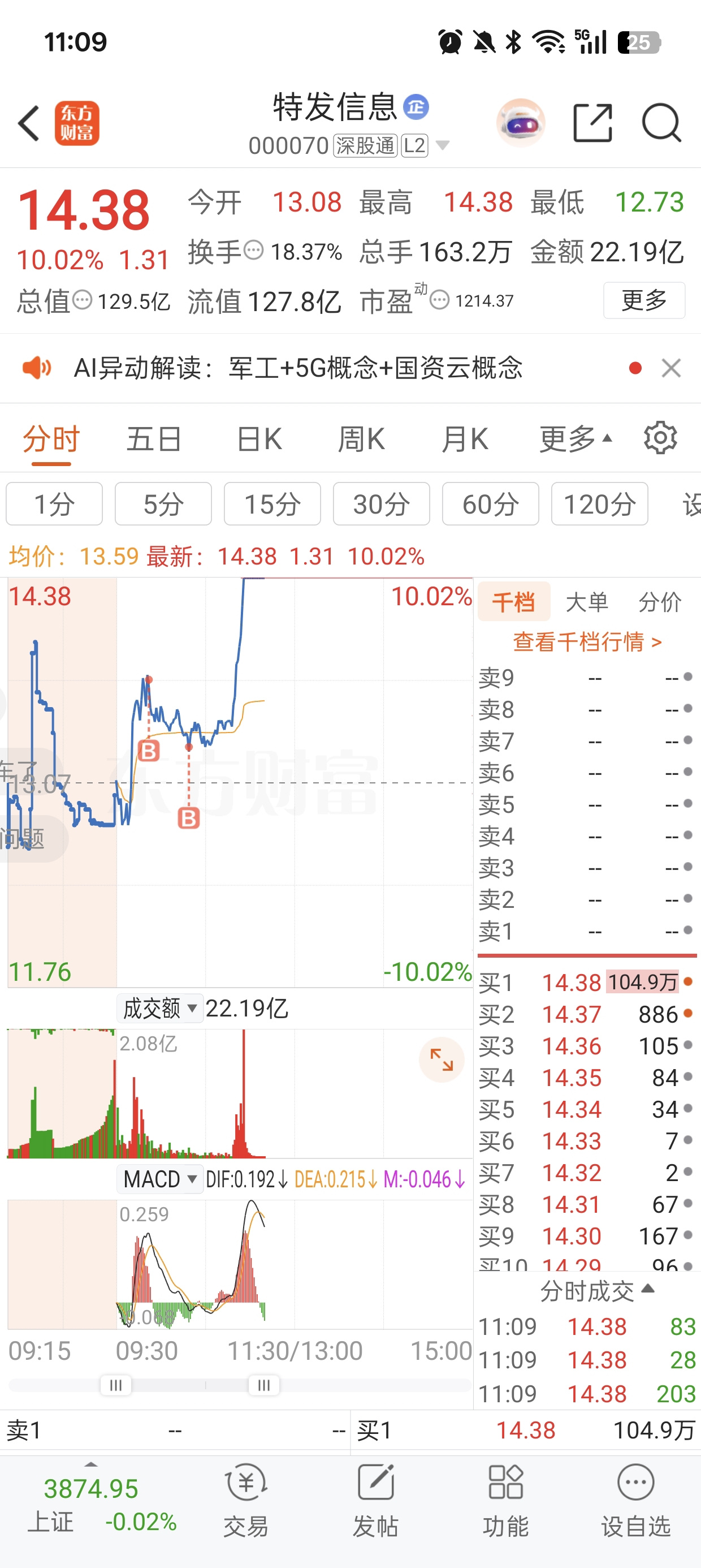 $特发信息(SZ000070)$ 昨天晚上看k线挺顺眼的,因为我炒股一半只看k线,有感觉我就关注。因为最近商用航天吸引力挺足的,然后发帖问问股友这股炒的什么?有啥热点之类的,再进一步分析一下。也说了准备和主力做t,今天被平潭绑着脚了,没来的级,早上一波拉升,让我果断加仓。知道是这样的,然后也是这样做的,感觉能控制自己一点了。