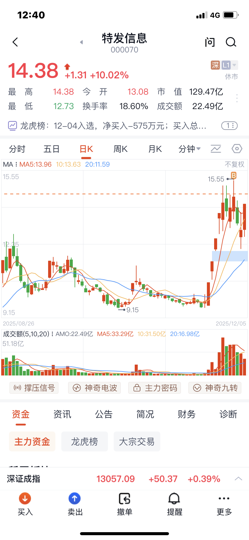 $特发信息(SZ000070)$ 我买了300股在顶部,就是看它那些天天天涨停不开心,一买就下坠,估计明天突破不了15
