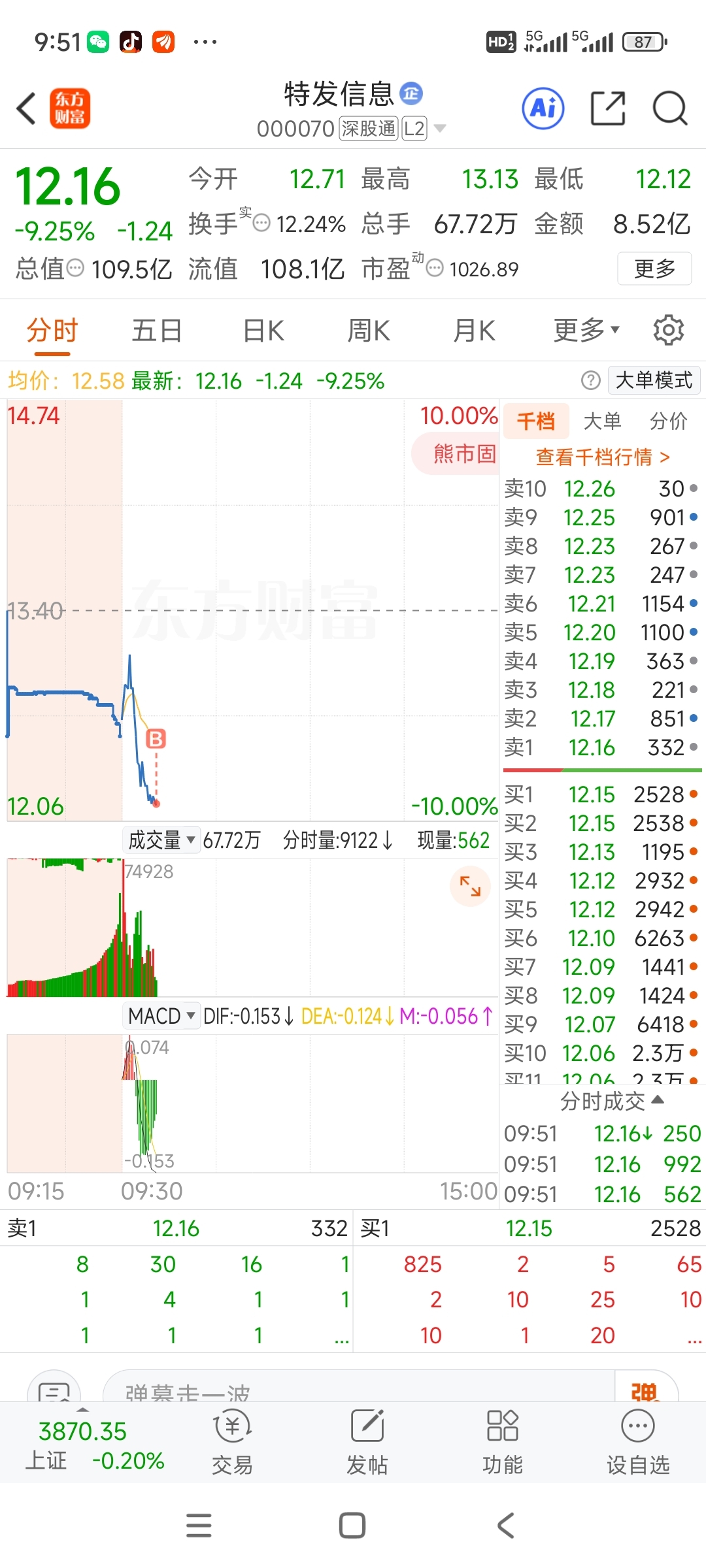 $特发信息(SZ000070)$ 我又回来了,周一连板啦