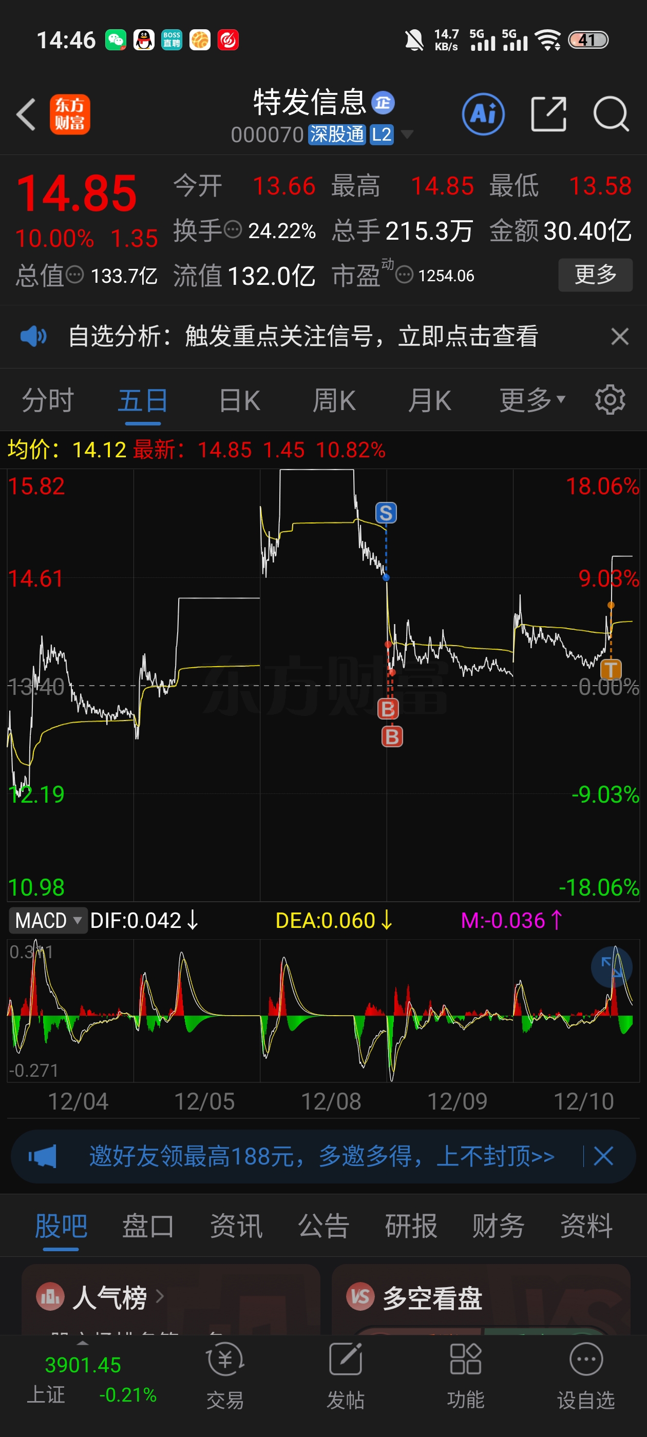 $特发信息(SZ000070)$ 该做T时没动手,不该做T时做了,还好没贪,又买回来了,也还好主力意志坚定封板了!还得修炼!!!