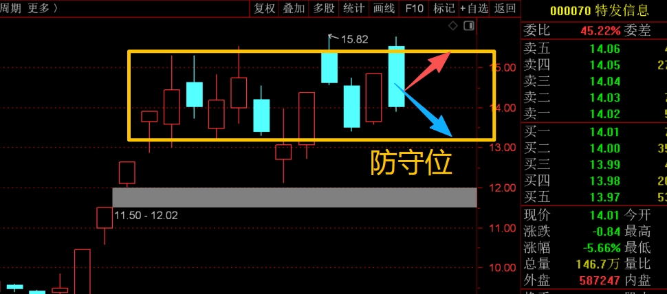 $特发信息(SZ000070)$ 今天冲高大幅回落,比较折腾,整体来看近期主要就是一个高位的横盘整理过程,接下来主要就看高位箱体的得失,能拉起来站稳都好说,继续震荡盘整,但有效跌破就要防着破位回调风险了,需要控制仓位应对,不要纠结,等走稳了再考虑回补。