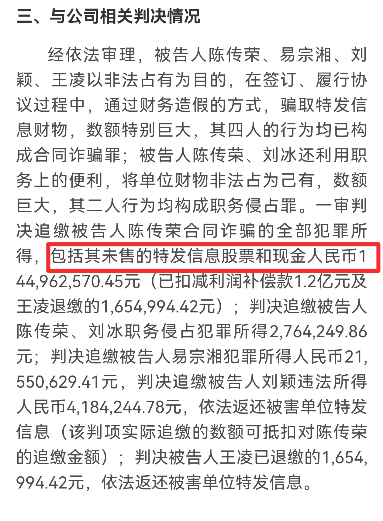 今晚公告的判决书对特发信息是特大利好消息!很多人却没抓住关键信息点:追缴陈未售的